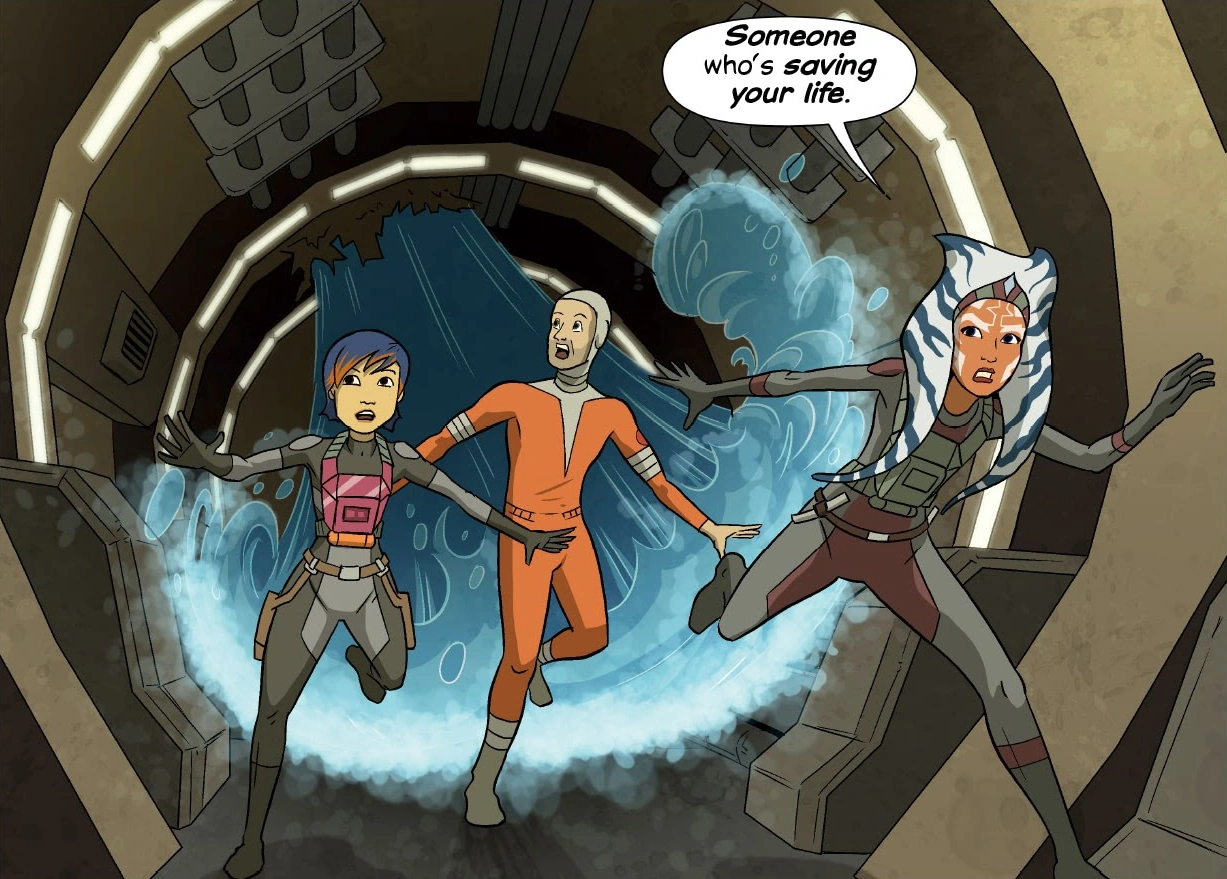 Despite Tano's outburst, her master agreed with her that they must search for survivors. At first, they were unsuccessful and were ordered by both Kenobi and Palpatine to give up their search. However, as Skywalker piloted the Twilight away, Tano sensed Koon and took the controls, piloting the Twilight to his escape pod's location. Tano and Skywalker found Koon with the clones Commander Wolffe, Sergeant Sinker, and trooper Boost. They learned from Koon that the Malevolence's weapon was an ion cannon mounted on an enormous ship that could disable ships. Tano then detected the Malevolence approaching them and hurried to disable power so they could blend into the debris field. At first, the ship passed, but it then detected the Twilight's medical droid TB-2, who was caring for the injured Wolffe, and fired the mega-ion cannon. Skywalker was able to outmaneuver debris and jump to hyperspace before the blast wave reached them.[16]