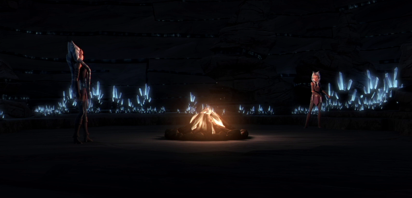 At some point, Tano traveled to the Jedi Temple on the ice planet Ilum to acquire a kyber crystal for a lightsaber, feeling the crystals, albeit without knowing that was what she sensed, as soon as the Jedi starship came out of hyperspace. She entered into the temple's cave after Grand Master Yoda told her she would know her crystal when she found it. As the opening to the cave slowly closed as the sun of Asar set, she urgently looked for her crystal until she calmed herself, thinking back on Yoda's words and only then seeing its light. Excited and ready to leave, she quickly made her way out of the cave with the tool for which she could build her own lightsaber. Although her visit to Ilum had overall been unremarkable, her decision to trust Yoda's teaching restored her ability to trust others after it was impacted by the false Jedi.[12] From there, she would construct said lightsaber using the kyber crystal under the tutelage of Jedi architect droid Huyang,[20] who fussed over her shoulder as she worked on it. At another point, Yoda taught her that she could sometimes find something she was not looking for in a situation.[12]