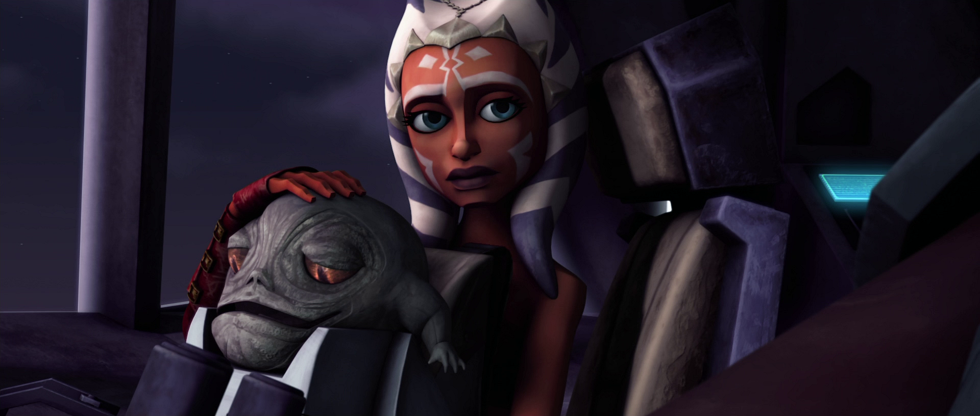While Skywalker distracted Dooku, Tano and R2 took Rotta to Jabba's palace. However, they came under attack by several MagnaGuards. Tano fought the MagnaGuards, destroying them all and meeting up with her master at Jabba's palace. However, Jabba ordered their execution until he was contacted by his uncle, Ziro. Senator Padmé Amidala then revealed to Jabba that his uncle was working with Dooku and was the one who arranged Rotta's kidnapping. Jabba then spared their lives, and Tano and her master were picked up by Master Kenobi and Yoda.[8]