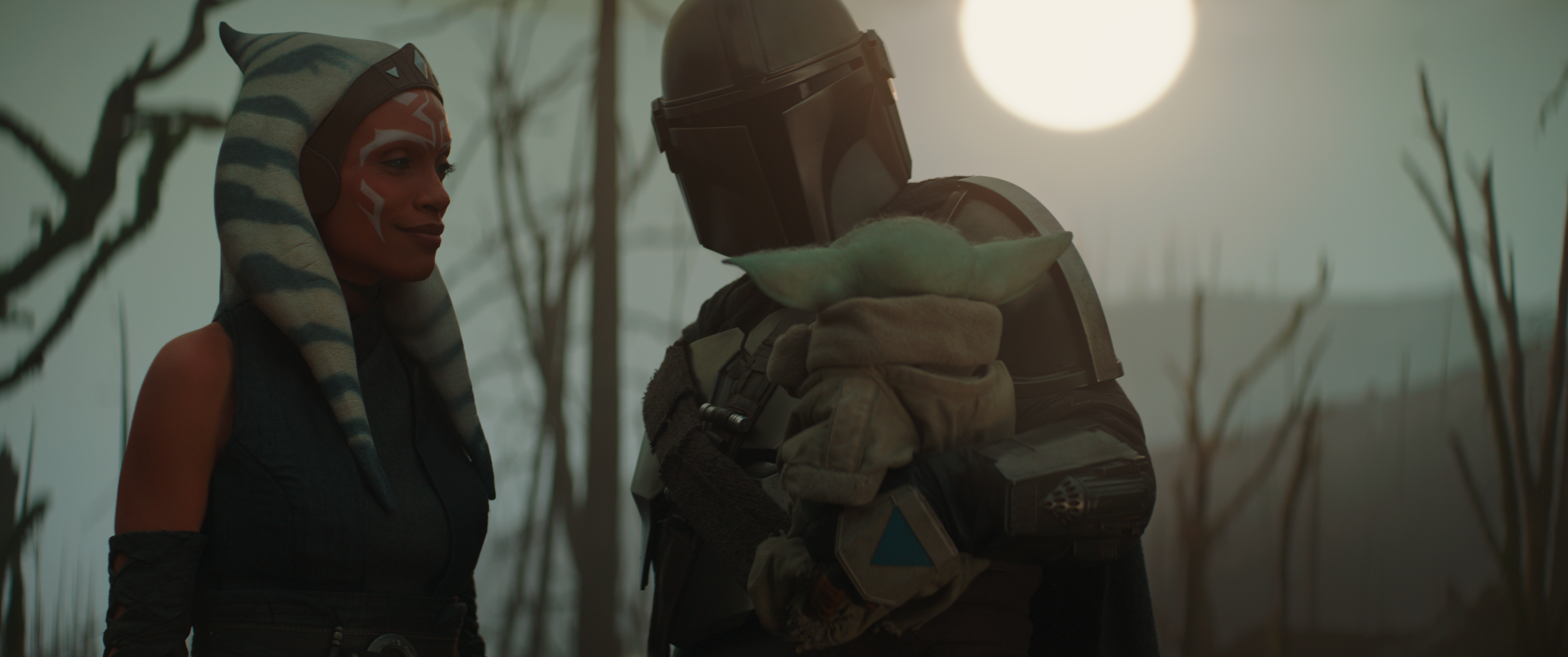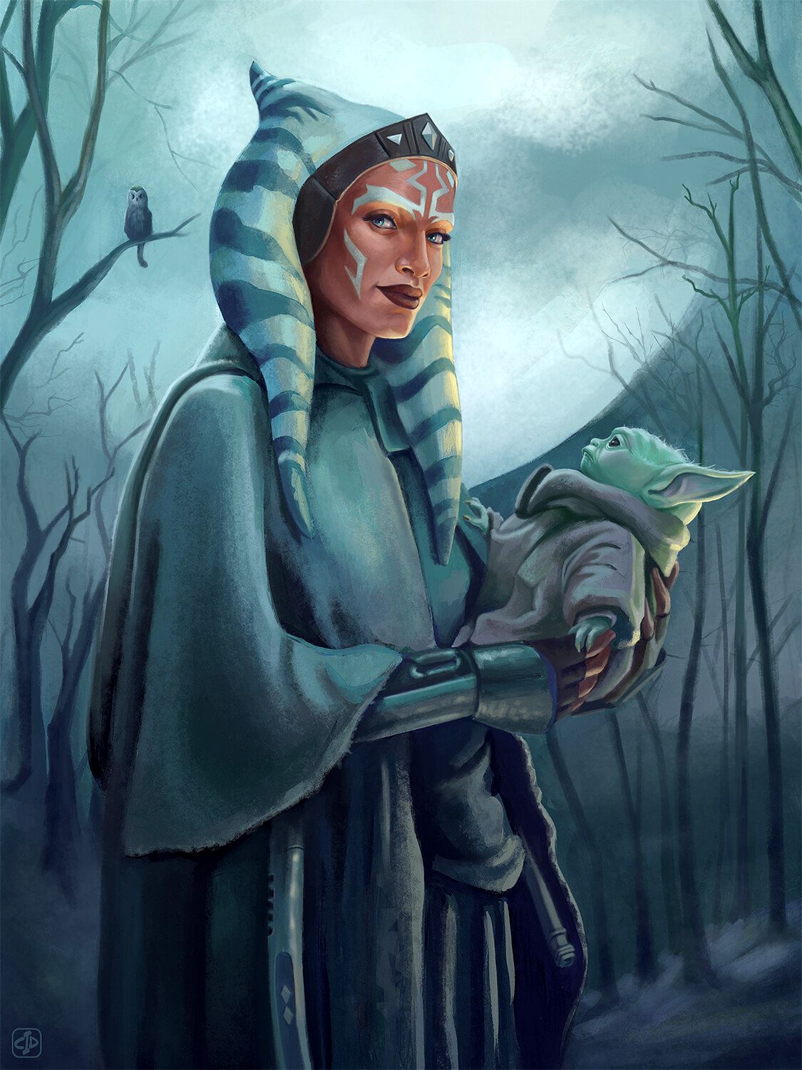 However, Tano was unexpectedly saved from Vader's wrath by a future Ezra Bridger, who pulled her through a portal into the World Between Worlds, a mystical plane of the Force connecting all time and space. After a confrontation with Darth Sidious, who desired access to the dimension, Tano returned to her time, promising Bridger that she would find him once she returned. After the end of the Galactic Civil War, Tano joined Sabine Wren in her quest to find the missing Bridger, who had disappeared during the Liberation of Lothal, and trained Wren in the ways of the Jedi until parting ways. Tano later journeyed to the city of Calodan on the forest planet Corvus looking for information on the location of Grand Admiral Thrawn, who had disappeared alongside Bridger, from Magistrate Morgan Elsbeth. Needing to rescue the city from Elsbeth's rule, she allied herself with the Mandalorian Din Djarin, who had been on a quest to bring the Force-sensitive youngling Grogu to the Jedi. After freeing Calodan, Tano refused to train Grogu and directed Djarin to the planet Tython instead. She later visited Luke Skywalker at his new Jedi Temple and, when Skywalker found Grogu in his care following a summons from the seeing stone, oversaw his training of the child temporarily.