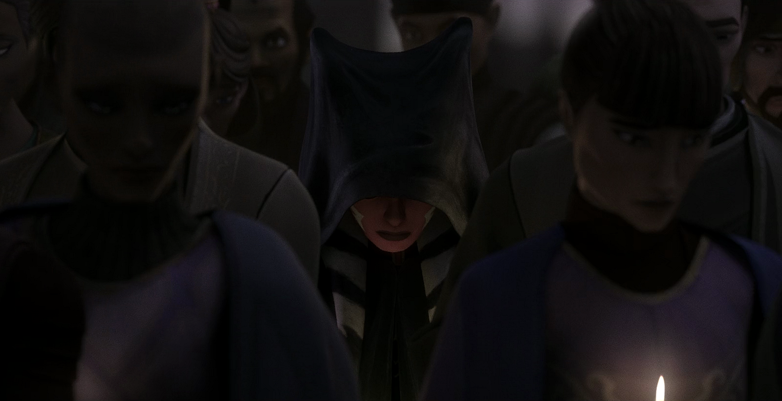 Tano gained much experience on and beyond the war front, leading a group of Jedi younglings to revolt against their Trandoshan captors, helping rescue a colony of Togruta from enslavement by the Zygerrian Slave Empire, and serving as an advisor to the Onderon rebels—with her close friend, Lux Bonteri, among them—as they liberated their world from the Confederacy. In a stark turn of events, Tano was framed for the bombing of the Jedi Temple hangar and other homicides, and she escaped into the Coruscant Underworld to clear her name. Though she formed an unlikely alliance with Asajj Ventress, she was detained by Republic forces and was consequently barred from the Jedi Order. Ultimately, Skywalker uncovered the true culprit, Tano's friend, and fellow Padawan Barriss Offee, and prevented his former apprentice from being convicted of sedition. Nevertheless, the ordeal dislodged Tano's faith in the Jedi. She refused the Jedi High Council's offer to rejoin the Order, instead departing in search of a new path. Tano briefly returned to lead Republic forces during the Siege of Mandalore and faced Maul and his allies. Order 66 was enacted shortly after the Sith Lord's capture and Tano alongside Rex, after freeing Rex from the control of Order 66, escaped the rest of her 501st division. Faking her death, she was forced into hiding.