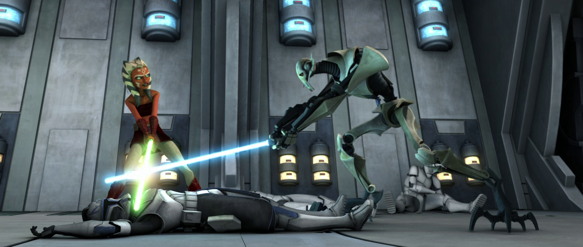 Upon receiving a transmission from R2 aboard Gha Nachkt's ship, Tano and Skywalker followed the transmission coordinates to Grievous's Separatist listening post on one of Ruusan's moons. To avoid the station's scanners, Tano, Skywalker, R3, Rex, Denal, and several other clones skydived from the Twilight onto the station's surface, gaining entry via lightsaber. Once inside, Skywalker went to rescue R2 while Tano and the clones began to plant explosives all around the station. However, as Tano and the clones advanced through the station, they were found by a force of droids and were pinned down. Unbeknownst to them, R3 was the one who contacted Grievous to help him locate the infiltration team. After they defeated the enemy, Grievous personally came to attack them. While Tano initially remained confident that they could defeat him like the other droids, Grievous quickly overpowered her before he killed all of the troopers save Rex and Denal. Before he could deal a killing blow to Rex, his strike was parried by Tano's own lightsaber, and the two engaged in a duel. Far outmatched by the cyborg General, Tano retreated into another room full of spare droid parts along with R3. As she hid, she contacted Rex and ordered him to proceed with the mission and continue to plant explosives with Denal while she distracted Grievous. Then, she was discovered and ambushed by Grievous thanks to the betrayal of R3. She escaped into the ventilation shaft and rendezvoused with the rest of the crew at the hangar and saw that R2 had been rescued. They escaped on board the Twilight, this time with R2, just as the station exploded.[30]