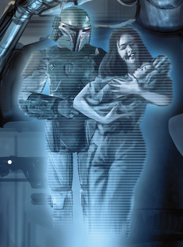 A holographic image of baby Ailyn with parents Boba Fett and Sintas Vel.