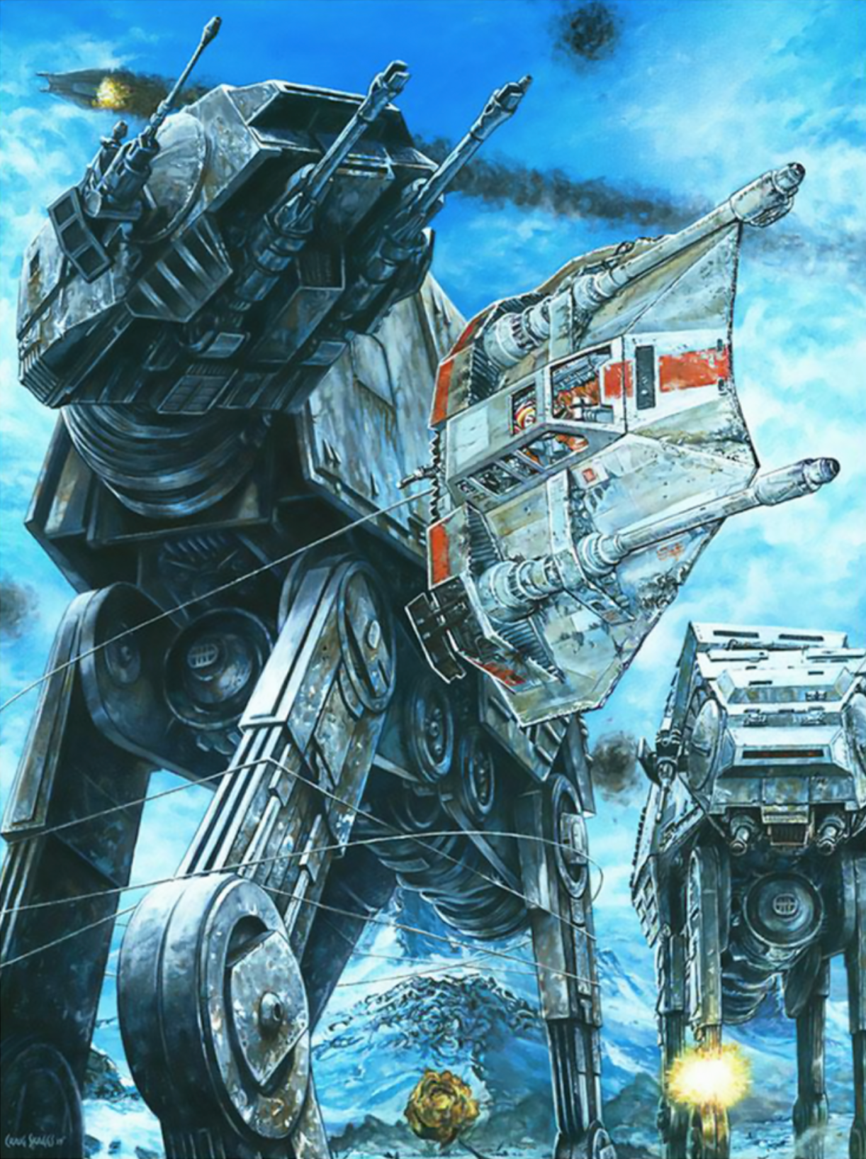 Rebel snowspeeders engage the AT-ATs of Blizzard Force during the Battle of Hoth.