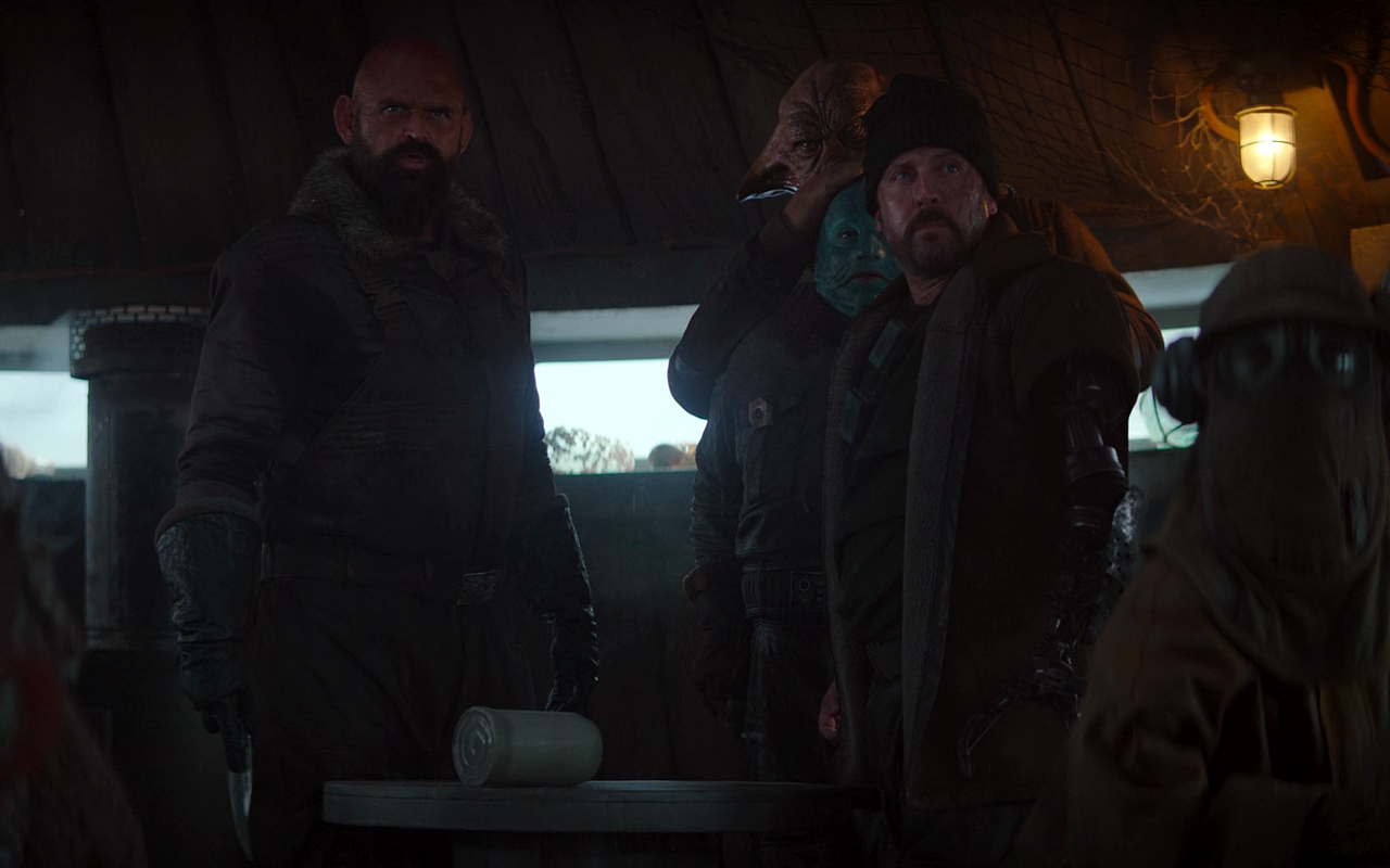 Before they could cut the Mythrol, they were interrupted by the Mandalorian bounty hunter Din Djarin's sudden entrance. Noticing the spilled drink on the table, he claimed the Mandalorian had spilled it while approaching him at the counter, signaling his companions.[1]