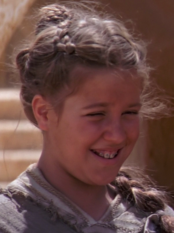 Amee was a human[3] girl[4] who was born on the planet Tatooine[1] in around 38 BBY.[2] She was a close friend of the slave Anakin Skywalker and spent time socialising with him and his friends Wald and Kitster Banai.[4] In 32 BBY,[5] when Amee was six,[2] the trio visited Skywalker in Slave Quarters Row with the children Seek and Melee. Skywalker, who was working on his podracer in a courtyard, informed them all that he would be taking part in the Boonta Eve Classic podrace the next day.[3]