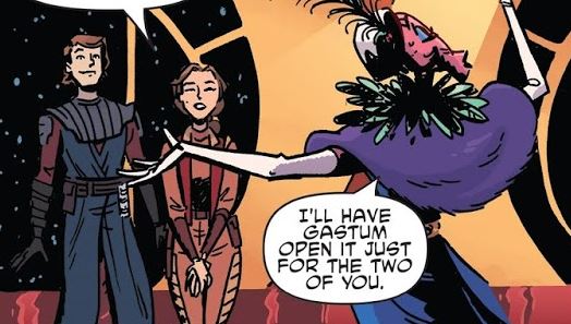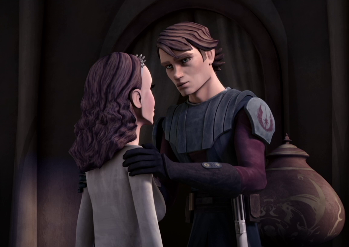 Skywalker had first met Amidala when she posed as a handmaiden and commoner at Watto's shop in Mos Espa. There, Skywalker asked if she was an angel. He was then surprised when Padmé revealed herself to be the Queen. Following the Battle of Naboo[11] and ten years later, Skywalker met with her at apartment following an assassination attempt on her. As Skywalker continued to protect Amidala from further attempts, they admitted their mutual love to each other. Skywalker and Amidala, following the Battle of Geonosis, married in secret.[13]