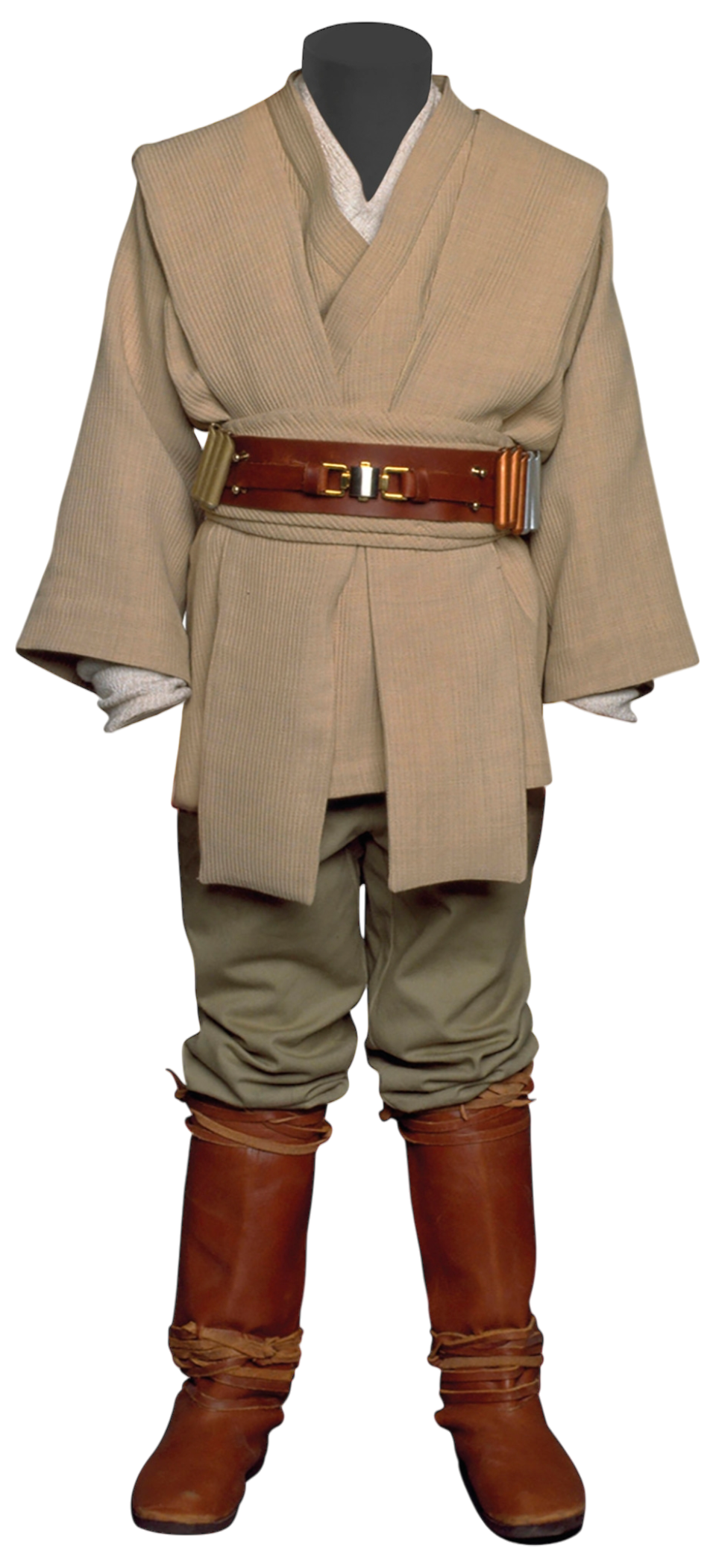 As a slave on Tatooine, Skywalker wore a tan tunic. Equipped with tools, he was able to rebuild C-3PO and complete his own podracer. During the Battle of Naboo, he piloted a N-1 starfighter and wore a Naboo pilot's helmet. After becoming a part of the Jedi Order, he wore Jedi robes and was given a Padawan braid.[11] He also kept a bit driver on himself, which he lost during the rescue of Yoda, and had his own lightsaber[41] that was destroyed on Geonosis. Afterward, he was given a replacement blade for the arena battle[13] before having a new lightsaber for the Clone Wars. During the early days of the war, Skywalker wore pieces of commander armor over his Jedi clothing.[16] Later, he wore different Jedi robes without the armor,[12] although he had donned the armor again when he met Commander Thrawn.[360]