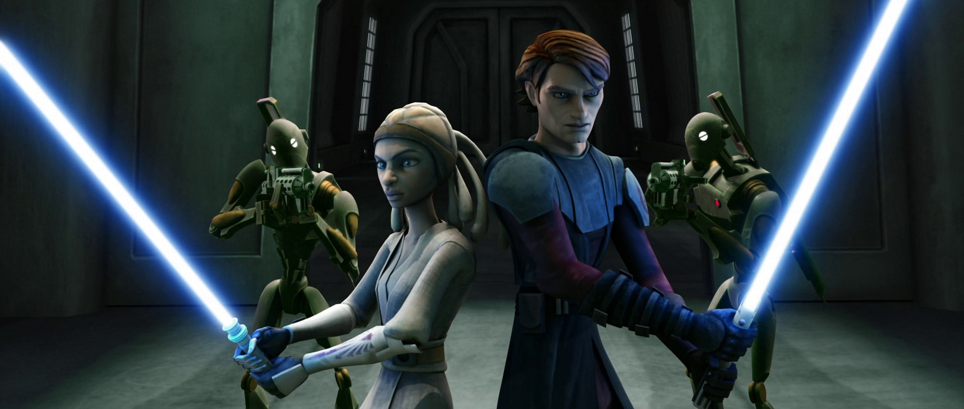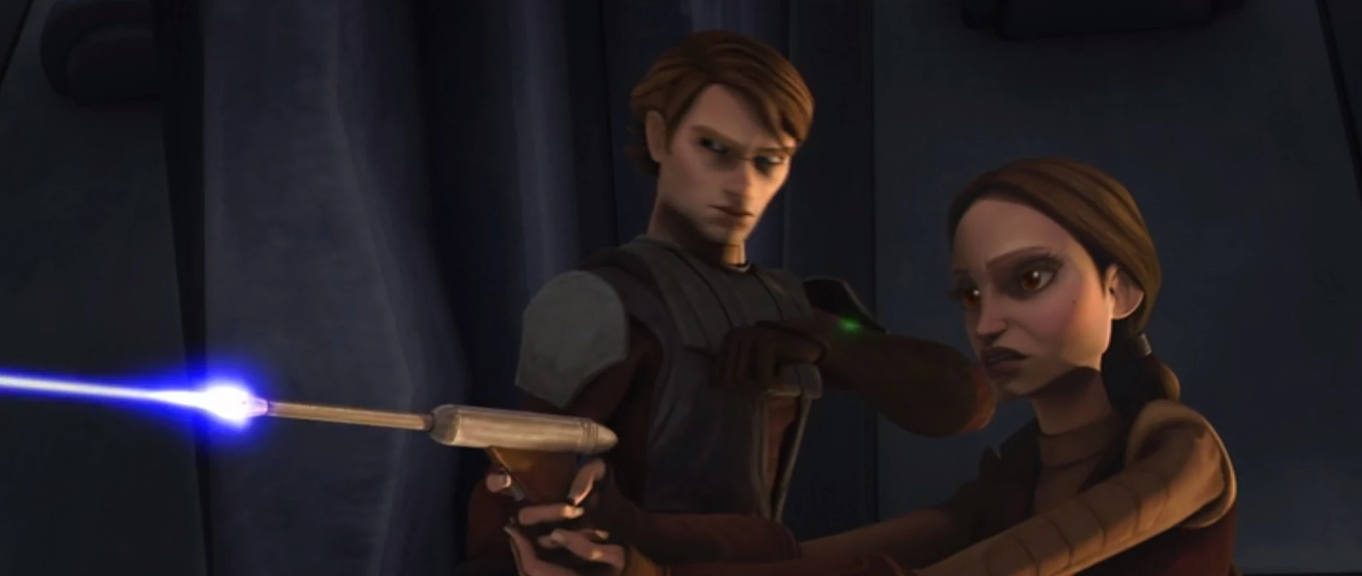 Despite being naturally extremely talented, Anakin Skywalker was initially lax with his lightsaber training, though he believed that he could rival the Jedi Masters. Despite his relative laziness, Skywalker was the best duelist in his class, even though he started later than his classmates. In his training he preferred lightsaber combat to Force mastery, and he spent more time on the physical aspects of becoming a Jedi. By the time he was nineteen, Skywalker was so gifted and skilled in dueling that he believed he already rivaled Master Yoda. When the Clone Wars began Skywalker was a skilled enough duelist to hold his own against one of the most skillful swordsmen in the galaxy, Count Dooku, lasting longer than his own master, Obi-Wan Kenobi.[13] During the war, his frequent engagement in duels with individuals such as the informal Sith apprentice Asajj Ventress,[16][57][104] Savage Opress,[111] Count Dooku,[16][135][170] and fallen Jedi Barriss Offee[146] allowed him to greatly improve his capabilities with a lightsaber. By the end of the war, Skywalker had the skill to single-handedly defeat Dooku in combat, despite the fact that the Count was one of very few duelists who could hold his own against Yoda himself. Dooku's taunts angered Skywalker, which unintentionally resulted in him tapping into the power of the dark side, also contributing to his victory.[12]