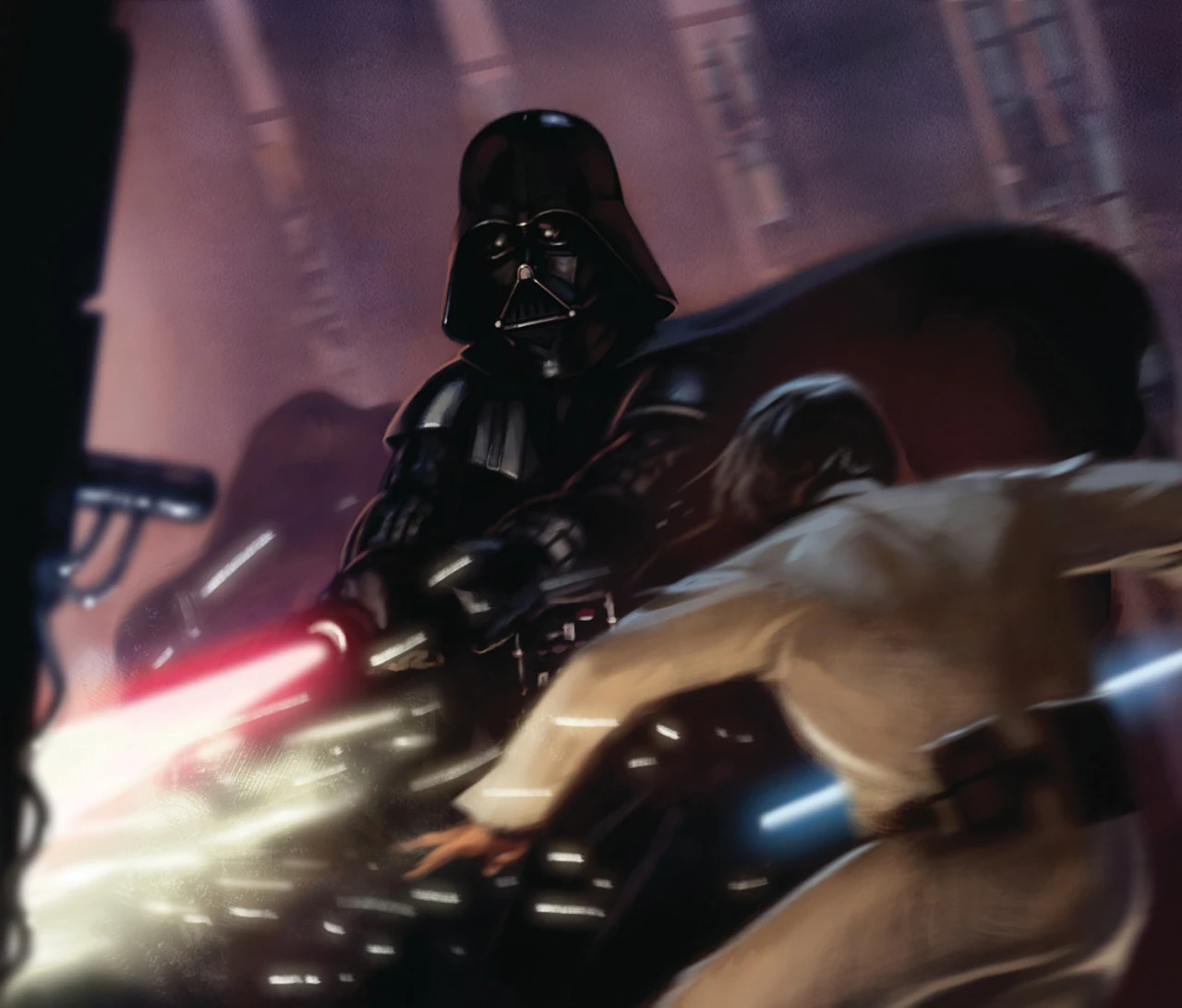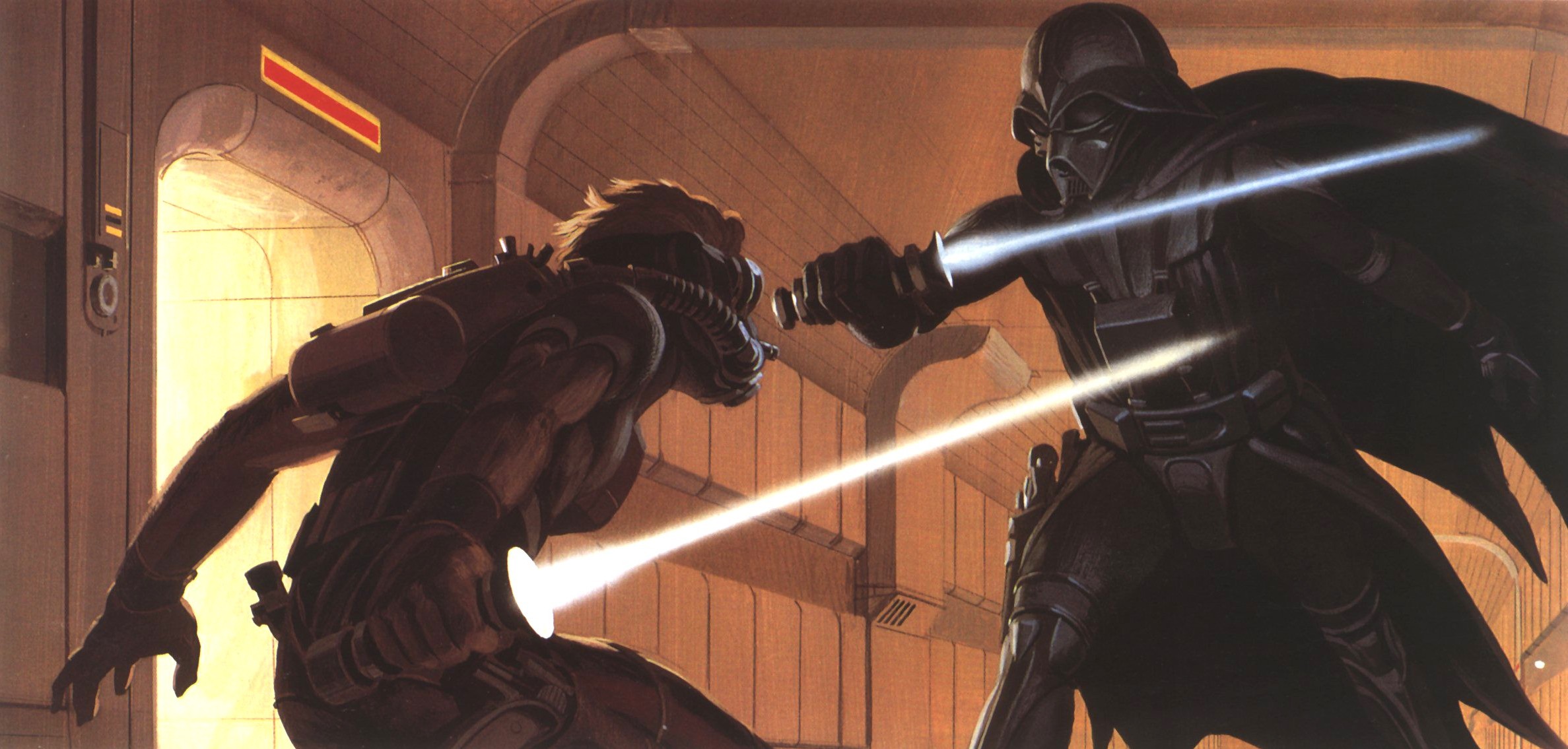 Concept art of Darth Vader fighting the character that would become Luke Skywalker.