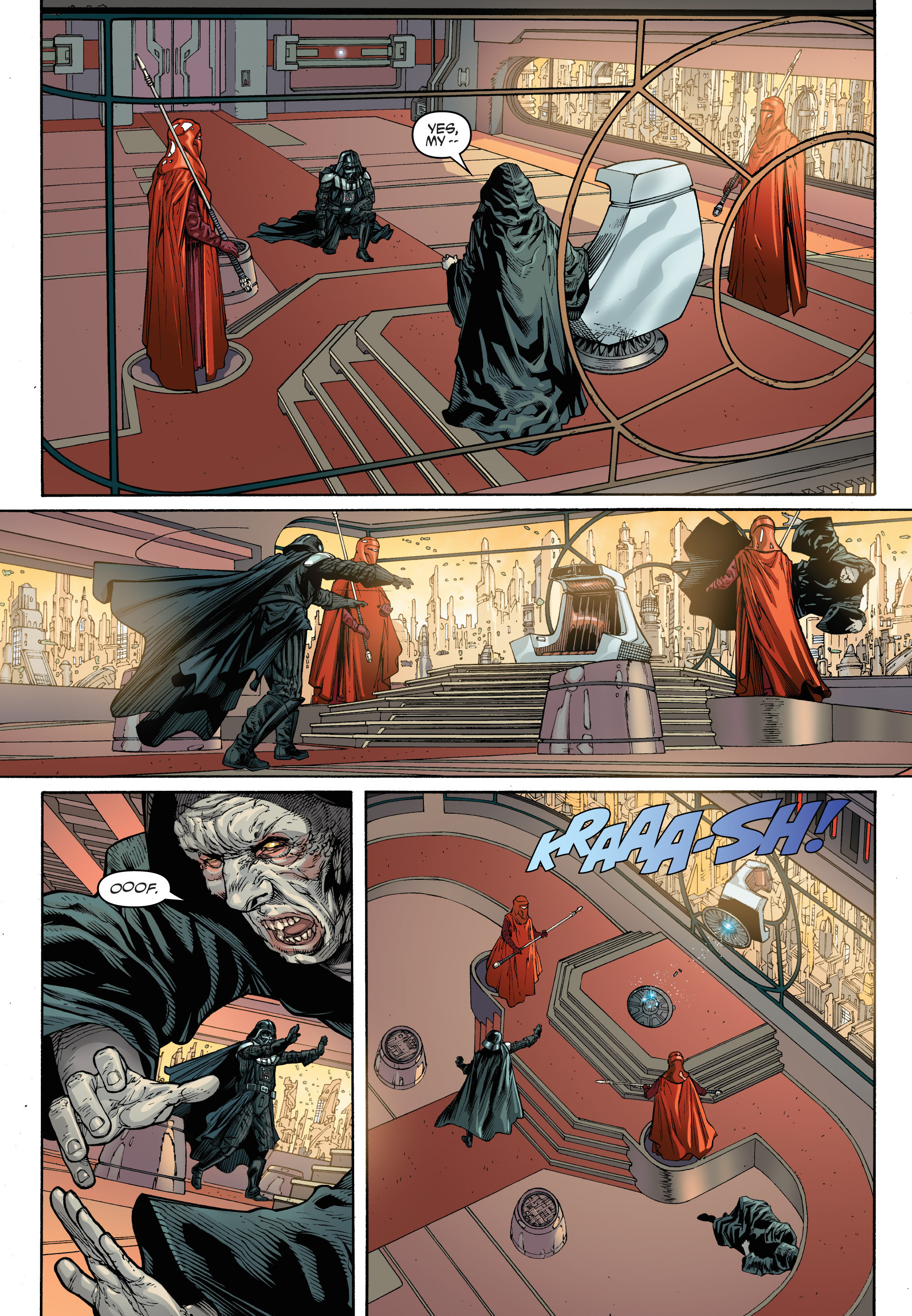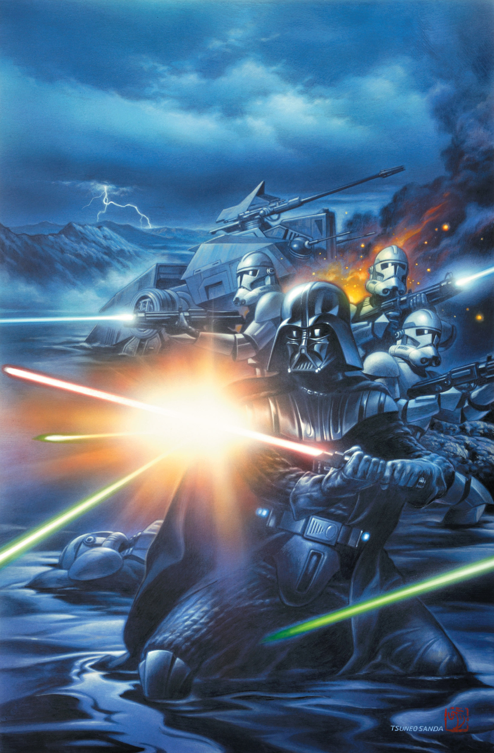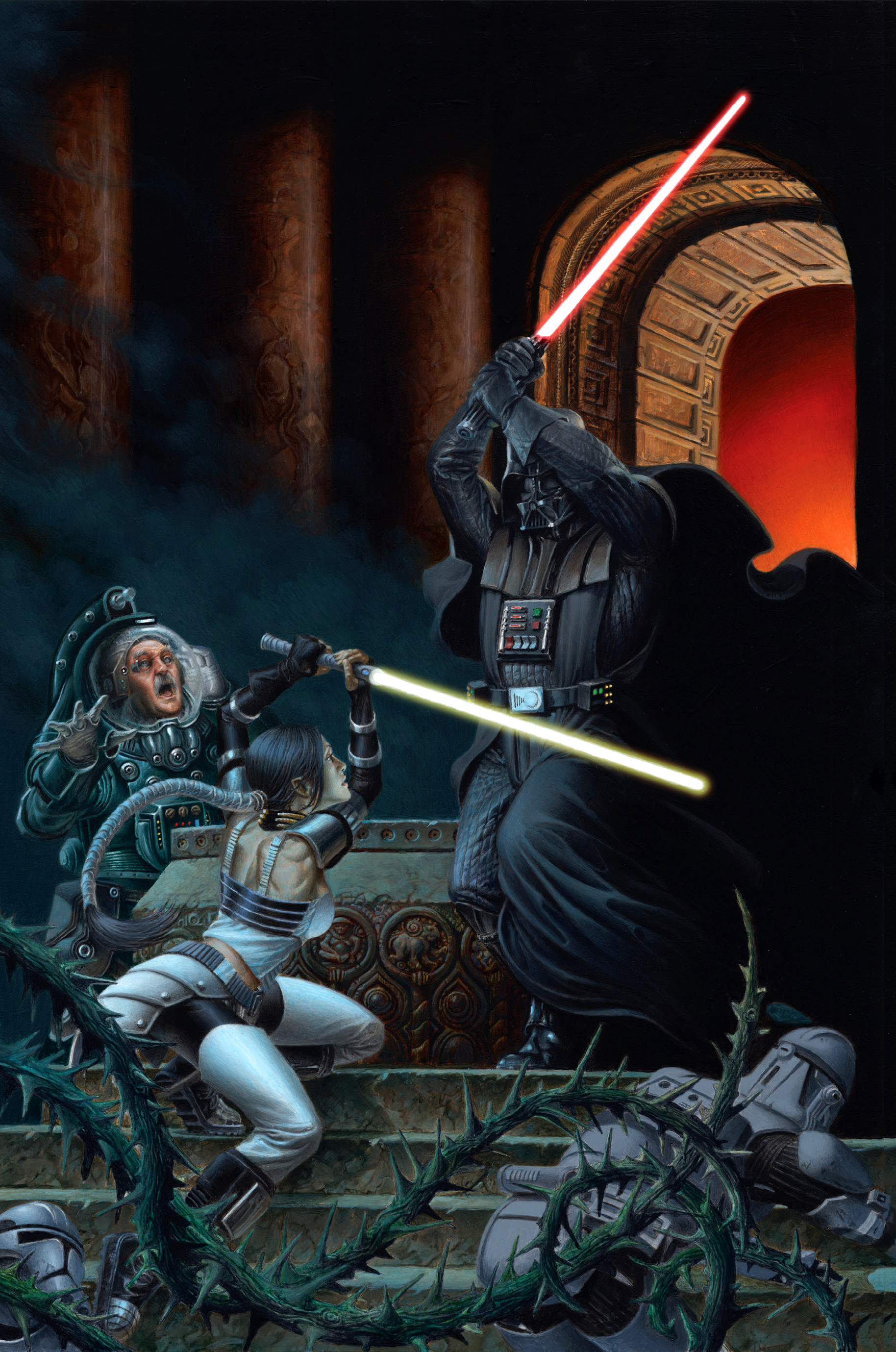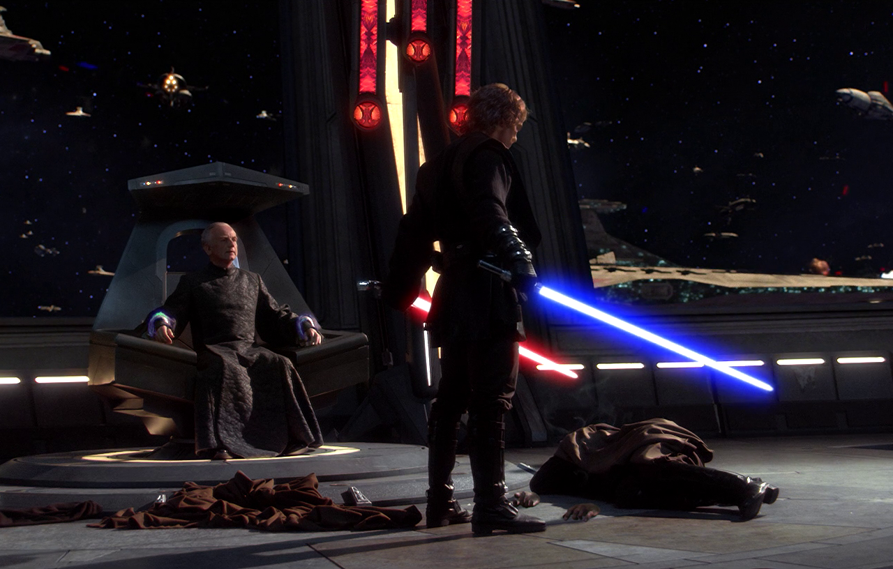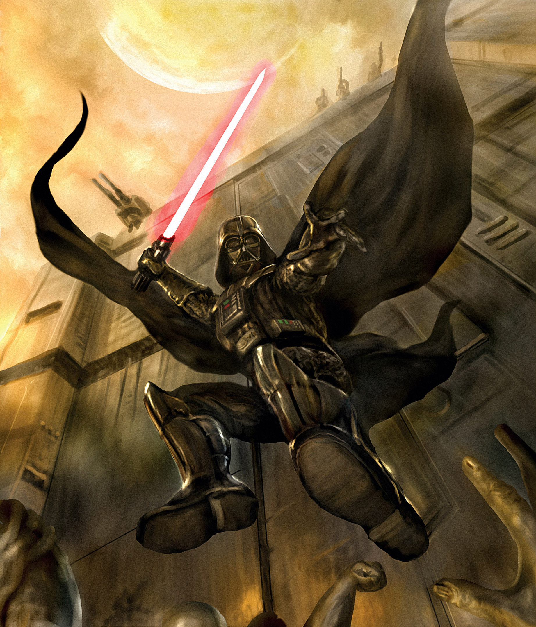 In the Revenge of the Sith video game, an alternate ending depicts Vader successfully leaping at Kenobi during their duel on Mustafar, impaling the Jedi from behind. The Sith Lord then greets Darth Sidious upon his arrival at the mining facility and receives a new lightsaber from his master, inspecting it briefly before running Sidious through with the blade. As the Emperor falls to the floor, Vader declares the galaxy to be his, and the stormtrooper guards lower their weapons in acceptance.[324]