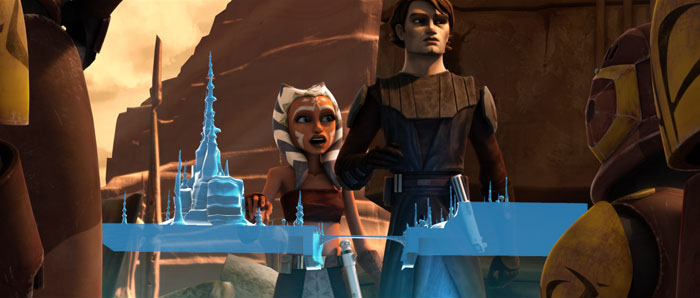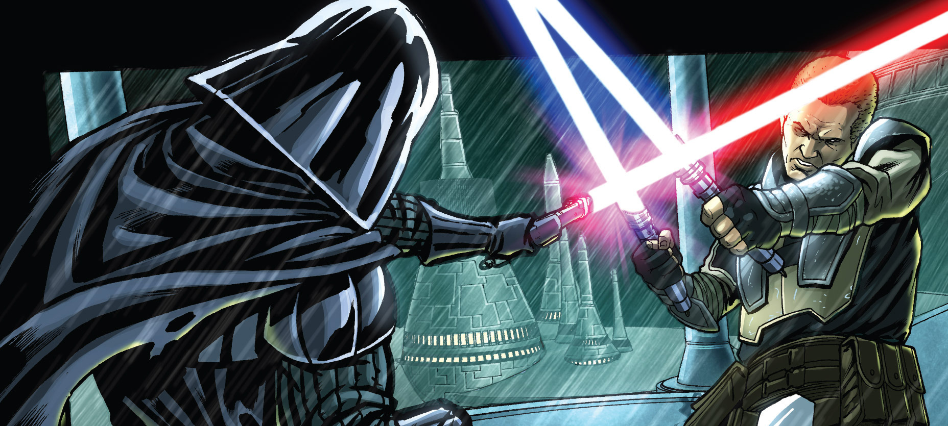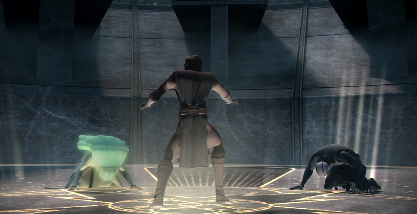 Star Wars: The Clone Wars Magazine 7 presents a Clone Wars Infinities storyline in which the Father never saved Skywalker from the dark side on Mortis, allowing the Son to kill the Father and plunge Mortis into darkness. Embracing the dark side, Skywalker defeated and abandoned Kenobi in the fiery depths of Mortis before killing Ahsoka, and he and the Son then departed Mortis in their now-repaired ship. Arriving on Coruscant, Skywalker was confronted by both Yoda and Darth Sidious, though he was able to defeat the two unlikely allies and struck them down and became even more powerful in the process. Entering the Senate chamber, Skywalker cast down dozens of Senatorial platforms before levitating himself onto the central dais, declaring himself Emperor Skywalker of the new Galactic Empire.[326]