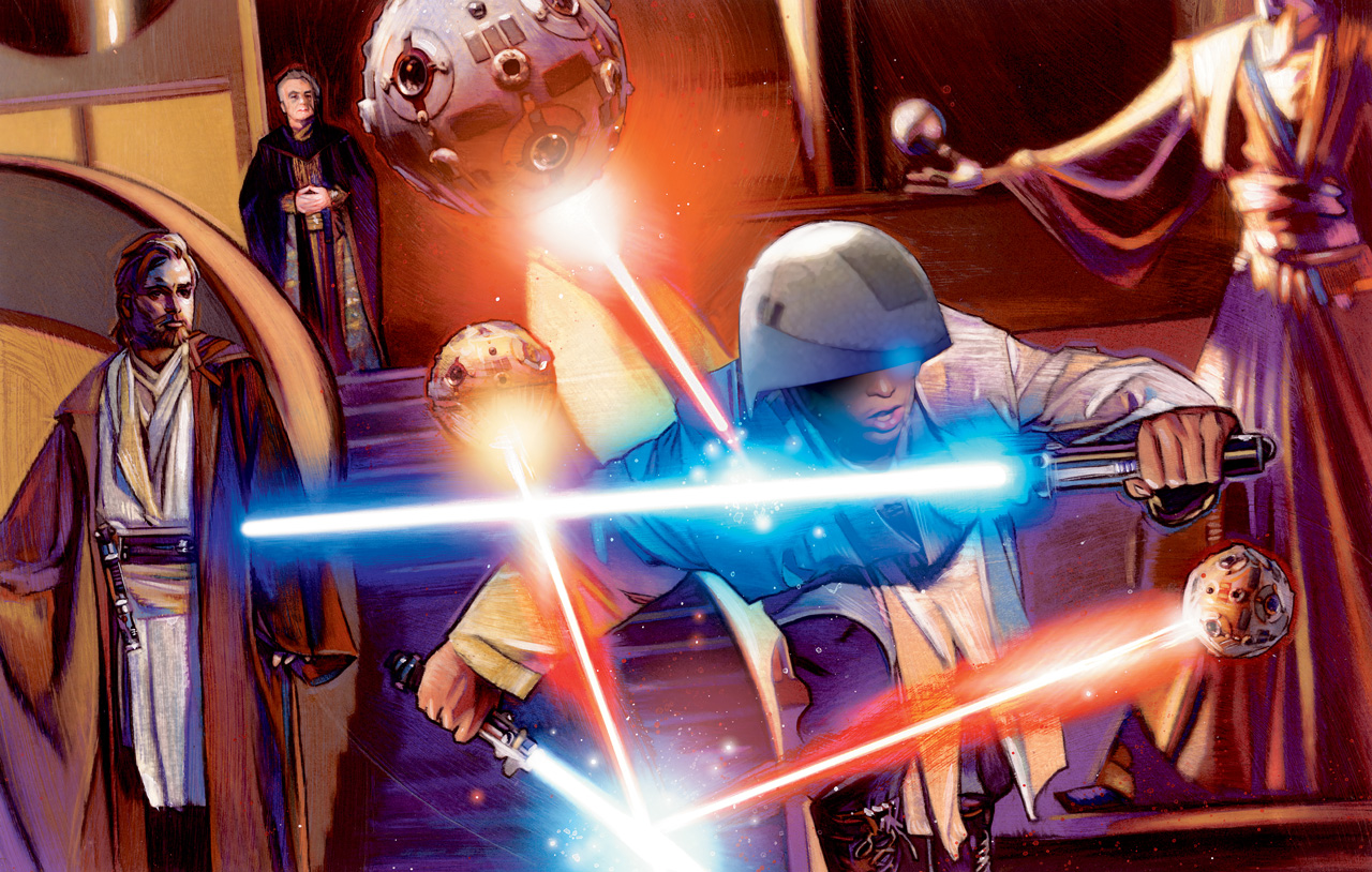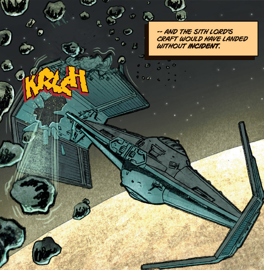 As they raced towards the starship that Naberrie and Jinn had come to Tatooine on, Skywalker was suddenly ordered to drop to the ground and complied just as a dark-robed figure shot overhead on a speeder. The man leapt at Jinn, drawing a red-bladed lightsaber and attacking the Jedi as Jinn urged Skywalker to get aboard the ship and to take off. Rushing aboard, he told Naberrie and the security officer with her Jinn's instructions, and Naberrie pulled him aboard to the cockpit to tell Jinn's apprentice Obi-Wan Kenobi what had happened. The pilot Ric Olié followed Kenobi's instructions to fly towards the fight, and Skywalker scrambled into a seat as Kenobi raced to the landing ramp and helped Jinn escape from the dark warrior. Skywalker rushed to help Jinn as the ship took off and left Tatooine.[5]