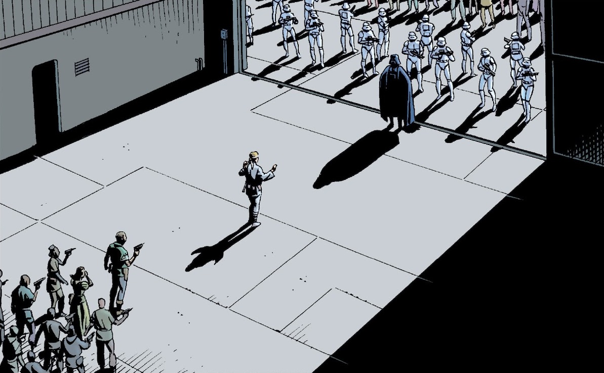The Dark Lord displayed proficiency in multiple defensive techniques. He could use Tutaminis to absorb and repel back the energy of blaster bolts, shown when he absorbed several blaster bolts from Han Solo's blaster on Bespin and repelled it back to disarm him,[298] and Force deflection to redirect blaster bolts, sometimes even at whoever fired them.[299] Vader was unaffected by Celeste Morne's Force waves that killed whole squads of Stormtroopers.[197] Vader was also capable of using two separate forms of Force Destruction, one that involved him blasting a massive amount of red energy and another that had him surround himself with a red energy field which acted also as a barrier strong enough to protect Vader from Marek's attacks, both with his lightsaber and the Force, showing Vader had became proficient in single-handedly creating Force barriers, whereas previously he was only able to create one with aid from other individuals.[229] In addition, he utilized either a semi-visible Force barrier or a protection bubble several times during the Gentis coup to fend off the attacks of Gentis's traitorous soldiers, capable of reflecting enemy fire rather than simply dissipating it.[205] Vader also knew how to utilize the Force cloak technique, having both applied it as Anakin and taught it to the Dark Apprentice.[20][65]
