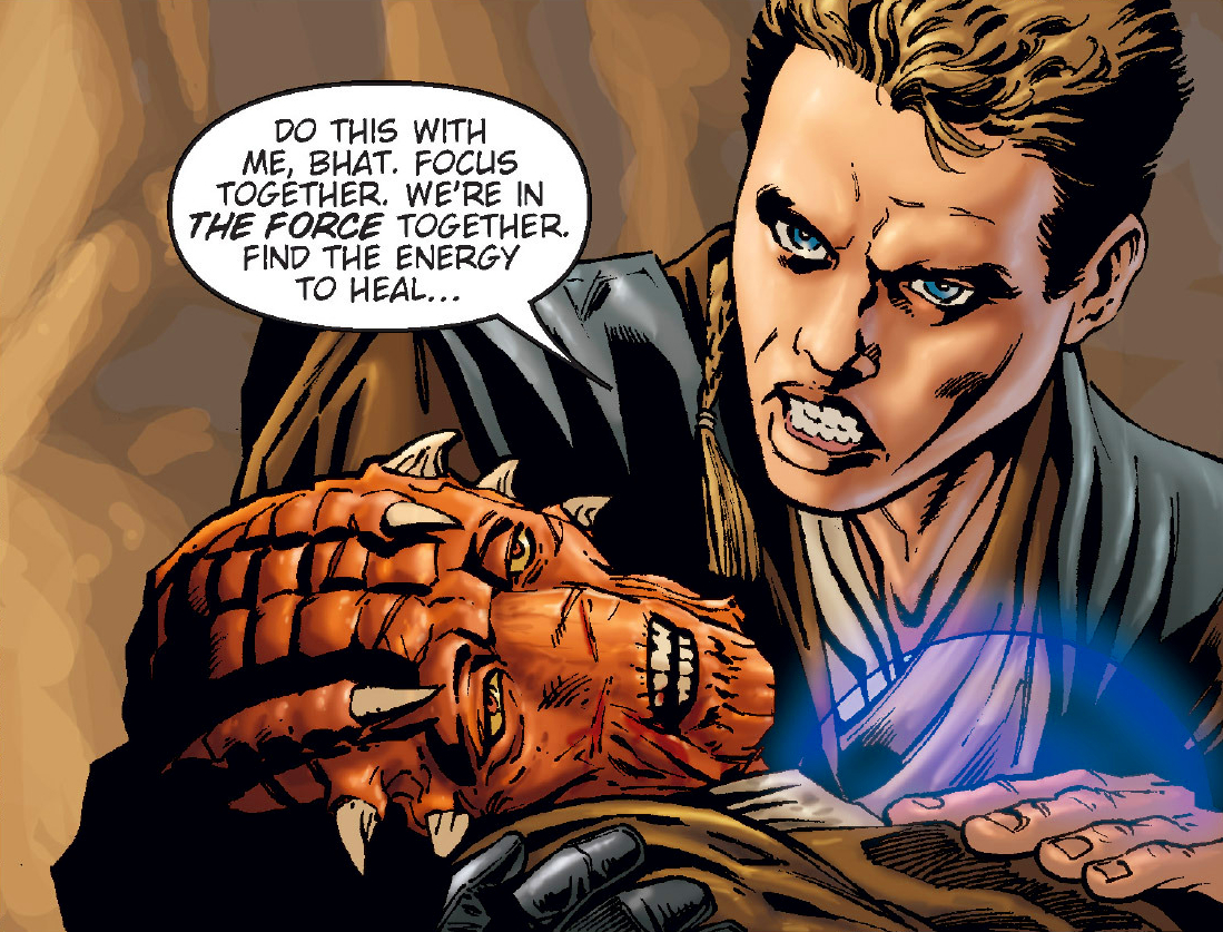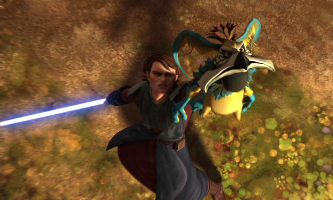 During the Battle of Geonosis, Skywalker displayed some skill in Animal friendship, allowing him to ride the Reek that was present in the arena.[12] His skills with Force healing were so poor that he did not bother trying to heal Obi-Wan when his friend was wounded by a bomb.[296]