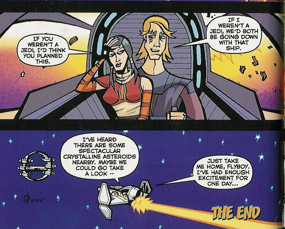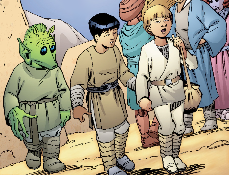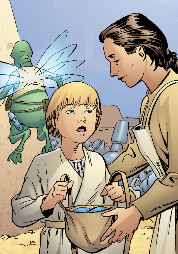 While exploring the junkyard a few days later, Skywalker came across the womp rat from earlier, which led him to an intact cooling unit for Jira. Looking up in the sky, Skywalker witnessed a starship flying by overhead, and he sank into daydreams of Jedi and angels. However, he was roused by Watto's shouting for him to come inside, and Skywalker entered the shop to find a tall man, a young woman, a Gungan, and an astromech droid conversing with Watto. At Watto's instructions, Skywalker manned the shop while Watto took the man, Qui-Gon Jinn, into the junkyard. Skywalker found himself unable to look away from the young woman, viewing her as supremely beautiful, and he hoisted himself onto the counter before asking her if she was an angel from the moons of Iego. The woman introduced herself as Padmé Naberrie, just as the Gungan—Jar Jar Binks—activated a DUM-series pit droid that began to wreak havoc in the shop. As Naberrie and Skywalker laughed, he told Binks to hit the droid on the nose, and after peace was restored to the shop, Skywalker declared that he would one day marry her.[5]