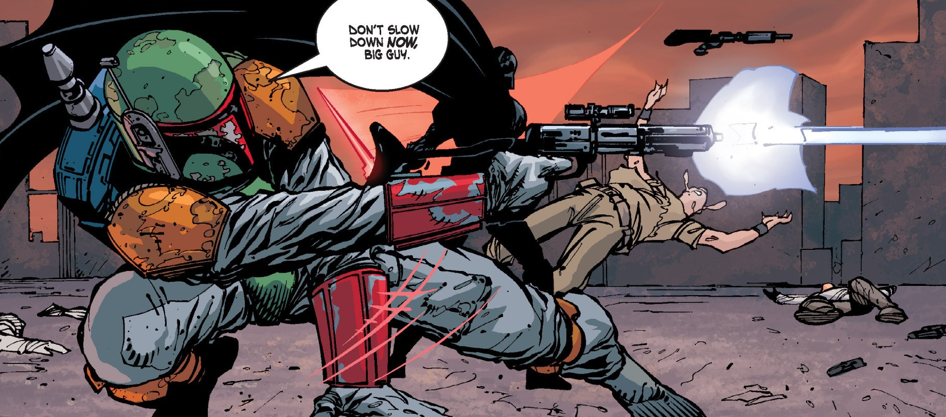 However, their plans went awry when Kitster was forced to stay with Gardulla the Hutt in the fortress's pool room, forcing Skywalker and the others to find their own way to the dungeons, and Dorn went ahead to scout around while Skywalker and Kiw'teksa stayed behind. When Kitster avoided being eaten by Gardulla, the fortress was thrown into chaos, and Skywalker and Kiw'teksa fled deeper into the dungeons when a Gamorrean guard pursued them—but Skywalker was unaware that his current route was taking them straight to the security control room. Skywalker managed to prevent the security chief from setting off the alarm by using his ion blaster, and Kiw'teksa closed the door just before the chief shot at him, causing the blaster bolt to ricochet and strike the man.[35]