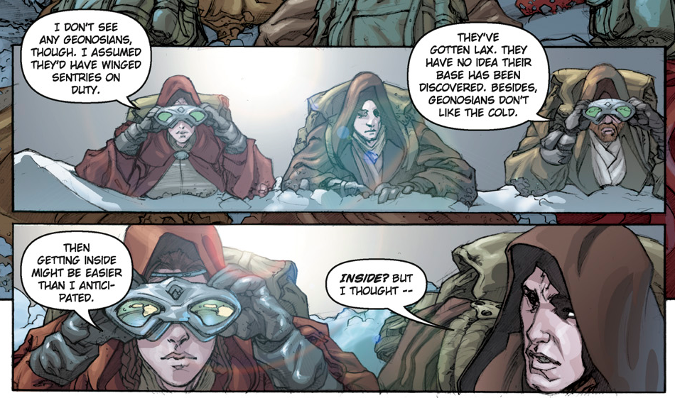 The following day, Banai and the Bothan child Dorn, both of whom were slaves of Gardulla, came to him with Pala and told him how they had hacked into Gardulla's computer network to learn that the Hutt intended to use the Ghostlings as lawn ornaments in her underground pleasure garden. Disgusted by Gardulla's disregard for how the Ghostlings would die in less than a year in those conditions, Skywalker agreed to help his friends break the Ghostlings out of Gardulla's dungeons. Donning Jawa robes and disguises, the three approached Gardulla's fortress on their sandskimmers, taking advantage of the dusk shadows to hide them, and Kitster led them to a narrow chasm that allowed them to reach the walls of the fortress unseen. An enormous cliffborer worm attacked them as they passed through the chasm, though the three escaped unharmed and reached the fortress, which they infiltrated through a ventilation grate in the outer wall.[35]