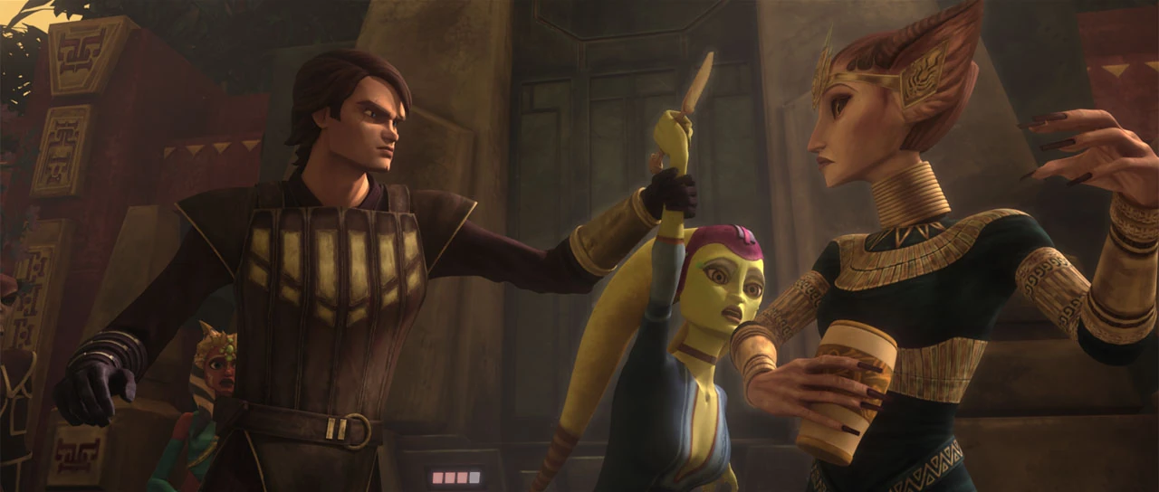 However, Skywalker's friend Kwi'teksa was uninterested in his discovery, and the other children nearby gathered to listen as she told them how she had been sold to the pirate Lord Tantos so that Tantos could train her as an assassin. Angry and saddened, Skywalker questioned Kwi'teksa as to Tantos's location so that he could go study Tantos and try and figure out a way to help his friend, but he suddenly realized that he had failed to investigate the crate when it was moved to a secure warehouse nearby. Kwi'teksa and the other children then served as a distraction to lure away the Gamorrean guards at the warehouse door, allowing Skywalker and Banai to slip inside and look at the crate, which they soon realized was an energy cage that was holding captured children. One of the children, Princess Arawynne, told the two boys that they were Ghostlings from the planet Datar and begged for their help, but Skywalker was unwilling to do so until she stated that the Ghostlings had not yet been implanted with transmitters.[35]