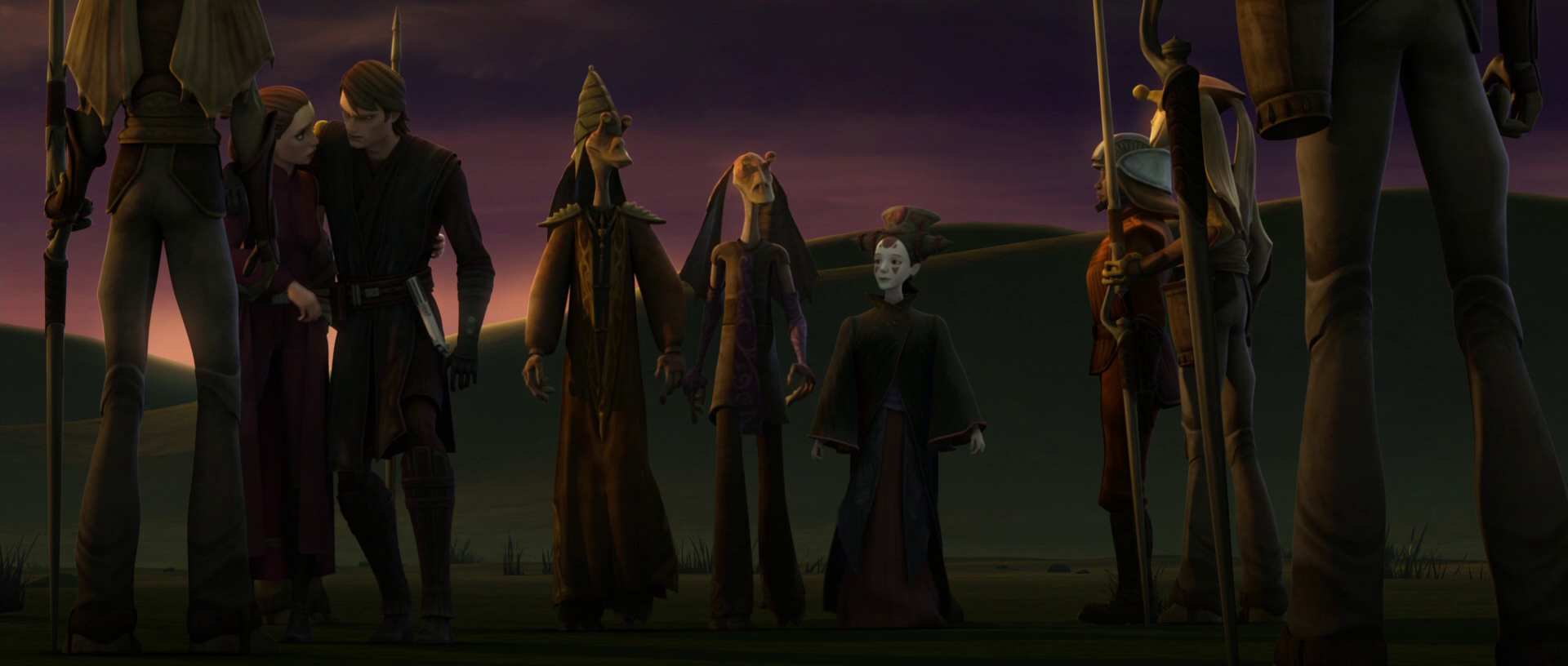 When they finally arrived at the Republic capital of Coruscant, Skywalker watched from the cockpit in awe as they approached the city-planet, and the ship was greeted when it landed by Supreme Chancellor Finis Valorum, Senator Palpatine of Naboo, and a contingent of Senate Guards. The Queen and her handmaidens—including Naberrie—departed with Palpatine, though they brought Skywalker and Binks along with them to Palpatine's office and left them outside while they discussed the situation. Skywalker soon began to listen at the door, though he began to wonder where Jinn and Kenobi had gone. Amidala changed into a new outfit before the group departed for the Senate Building, though Skywalker was unhappy to not see Naberrie among the handmaidens who accompanied the Queen, Panaka, Palpatine, Binks, and Skywalker to the Senate.[36]