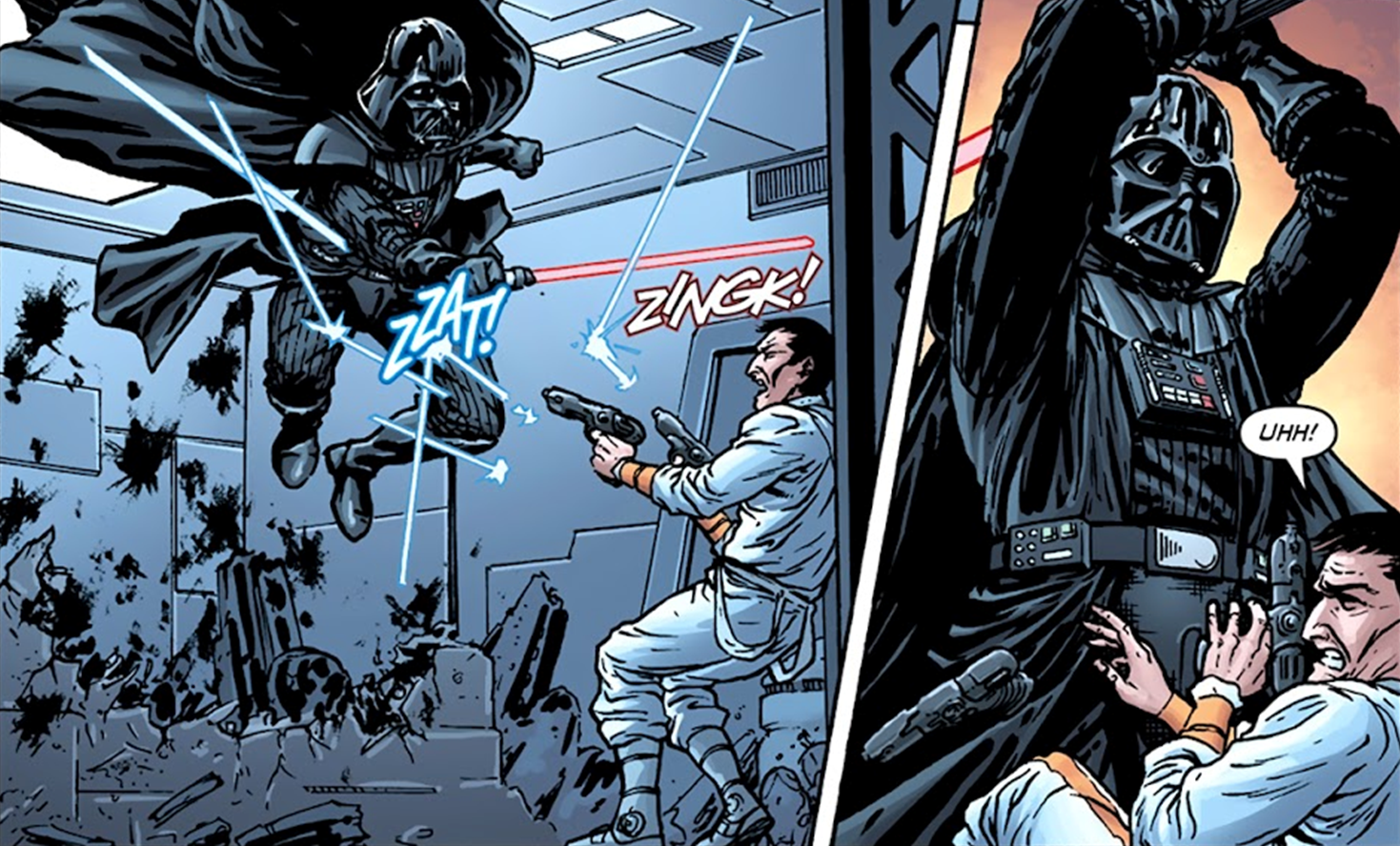 One of Vader's favorite tactics during duels was using Force Throw to pull apart objects in his environment and fling them at his opponents. This served as both an effective practical attack and a way of demoralizing his opponents.[15] Darth Vader first utilized this technique during his duel on Mustafar with Obi-Wan Kenobi, slicing shards of metal from the walls and shooting them at his opponent. However, Kenobi's mastery of Soresu allowed him to deflect the shards.[11] After gaining his armor, Darth Vader used this tactic to bring down Roan Shryne on Kashyyyk, ripping apart the wooden platforms in their battleground and flinging waves of debris at the Jedi from all sides.[183] Arguably his most well-known usage of this ability was against Luke Skywalker during their duel on Bespin, when he used it to batter Skywalker with objects in the room they were in. His effectiveness with this technique was further bolstered by the fact that he was capable of telekinetically gripping and hurling objects without the need to utilize the "throwing" motion that nearly all Force sensitives used. This was most evident during his fight with Luke on Bespin, where he surprised his son by telekinetically throwing a metal box at his head while maintaining a two-handed bladelock.[15] Additionally, when applying this technique against Roan Shryne, Vader simply stood in one place with his arms folded across his chest.[183]