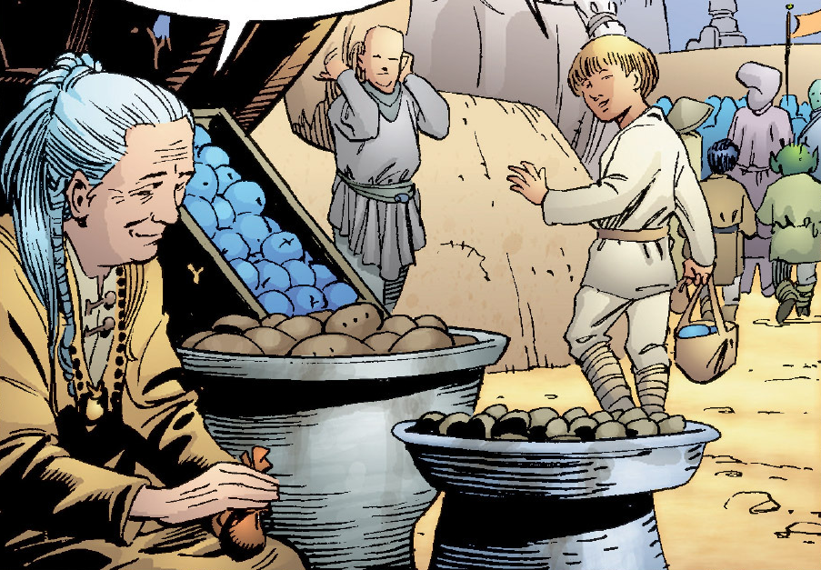 Just then, Watto and Jinn returned to the shop, and Jinn informed his companions that they were leaving. Fortunately for Skywalker, Watto allowed him to leave after he cleaned up the mess that Binks had made. As he headed home, Skywalker came across Binks, who was being attacked by Sebulba after the clumsy Gungan had disrupted the racer's meal. Breaking up the fight, Skywalker greeted Naberrie and the rest of her group when they arrived to see what was happening, and he convinced the group to follow him to Jira's fruit stand nearby, where he told the old woman about the new cooling unit he had found and then purchased four pallies. When Skywalker dropped one of his coins and Jinn reached to pick it up, the boy was astonished to see a lightsaber on the man's waist when his poncho opened slightly. Masking his surprise, Skywalker realized he only had enough for three fruits, and he forewent a pallie so the others could have one. When Jira warned the group that a sandstorm was coming, Skywalker insisted that the unprepared group come with him to his house.[36]