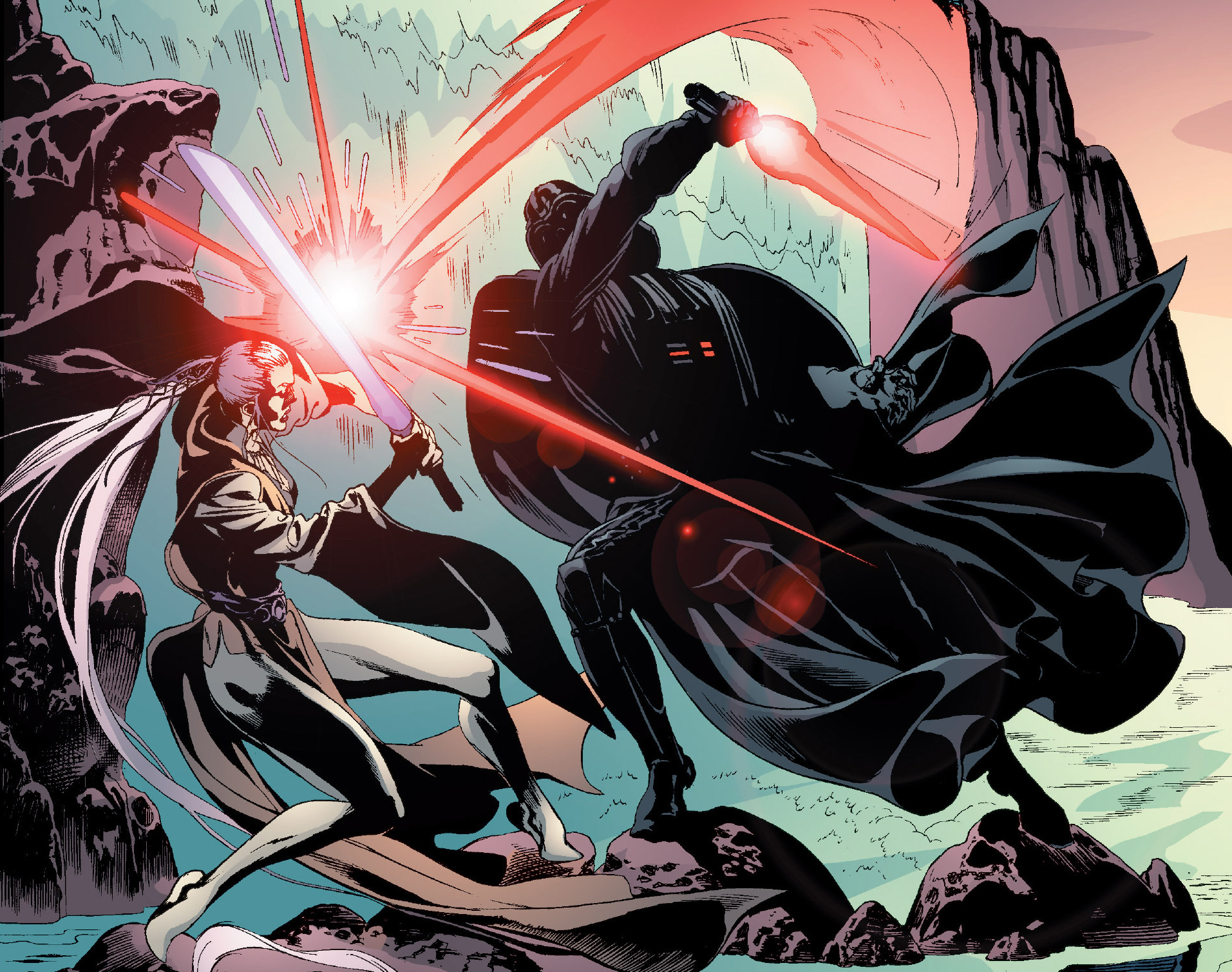 In Star Wars Infinities: Return of the Jedi, both the Emperor and Vader sense Yoda's death on Dagobah, and Vader is dispatched to Dagobah to learn what happened. Luke surrenders himself to Palpatine's forces and is brought before Vader and the Emperor, who also captured Leia, and Vader is ordered to kill Leia by his master. When Luke defends his sister and engages the Sith Lord in a lightsaber duel, Vader refuses to accept Luke's request for peace, forcing Luke to reveal that he and Leia are Vader's children. Stunned, Vader loses an arm to Luke's blade, and Vader turns away from the dark side and begs forgiveness from his children. The Emperor disappears in the chaos that results from the Rebel Alliance's successful attack on the station, and the Skywalker children escape the station with their wounded father, who abandons his Sith title and dons an all-white version of his armor. Declaring his loyalty to his children and the Alliance, Skywalker intends to hunt down the Emperor.[325]