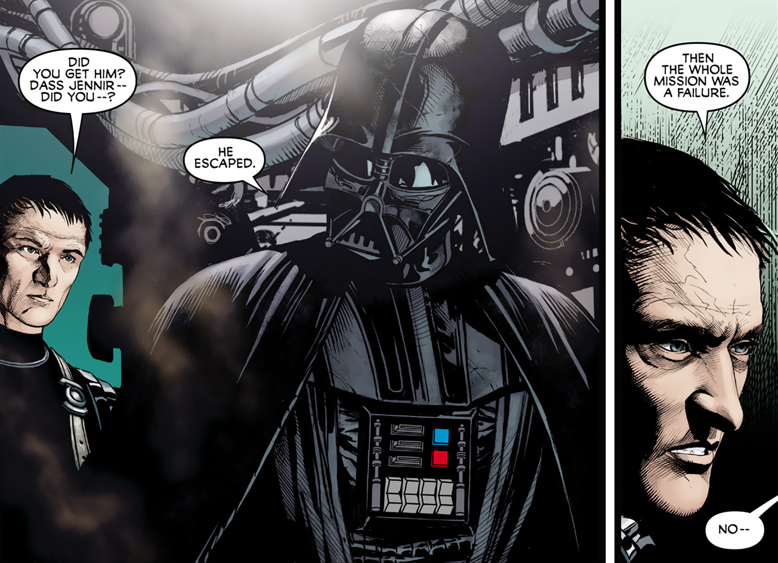 The character of Darth Vader was not originally planned to be a suited cyborg. In the original scripts for A New Hope, the name "Darth Vader" was given to a normal Imperial general. The concept of a cybernetic Vader was created when the concept artist drew the opening scene where Tantive IV was being boarded. It was initially imagined that Darth Vader would fly through space to enter the ship, necessitating a suit and breathing mask. This suit was later made permanent and incorporated in the story. Vader's usage of an all black uniform, alongside his devotion to Emperor Palpatine, was also intended to be an analogy to the Schutzstaffel (SS) in Nazi Germany.[312]