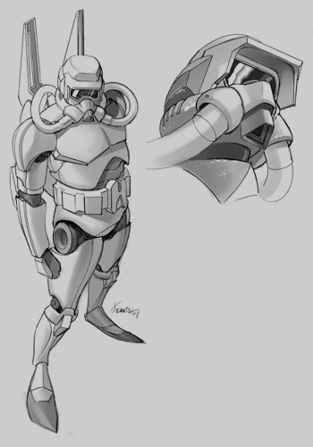 Many of the standard technologies employed by the Imperial military were modified for aquatic use, including specialized aquatic garrisons, custom TIE fighter boats, and powerful AT-AT swimmers. The armor of the seatrooper was based on the lightweight scout trooper design. It was worn over a two-piece environmental body glove that provides protection from uncomfortable temperature extremes, or toxic-water environments. Designed specifically for engagements on Dac and Tibrin, the seatrooper's armor was pressure-sealed to a maximum of ten atmospheres and included a rebreather that allowed to stay underwater for more than a hour.[1] The armor was more flexible than standard stormtrooper designs, preserving and even increasing a trooper's underwater dexterity. Supplementing a soldier's swimming skills are a back-mounted propulsion unit, and a pair of propulsion boots with snap-down flippers. Since blaster ranges are often adversely affected by underwater use, the seatroopers carried a blaster rifle/speargun hybrid as a standard weapon. In 137 ABY, the seatroopers of Darth Krayt's Galactic Empire used plasma rifles.