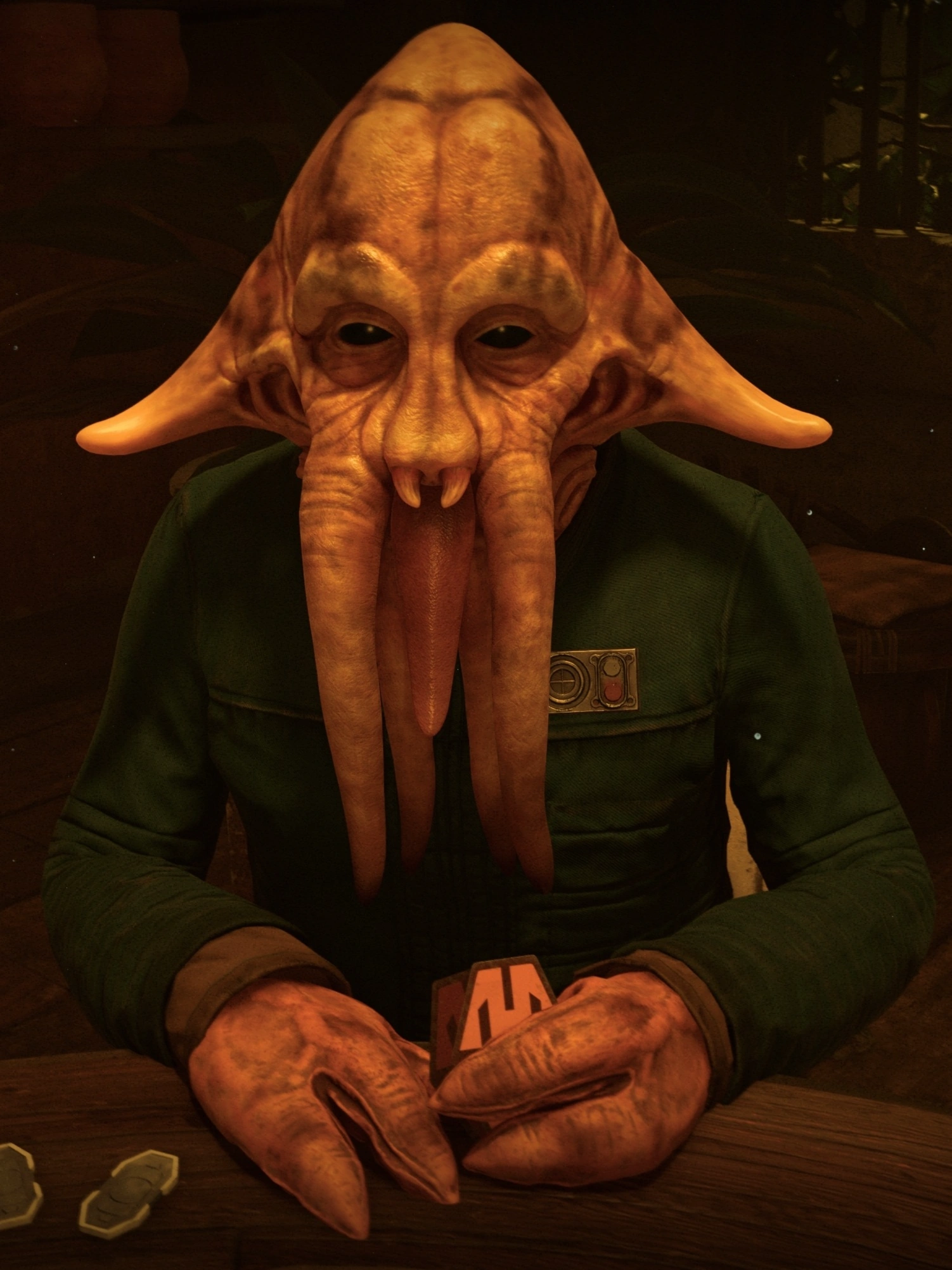 Aquesh appeared in the 2024 video game Star Wars Outlaws, developed by Massive Entertainment and published by Ubisoft. In the game, they were at one of several sabacc tables that the player could optionally choose to play against in order to earn credits.[1]