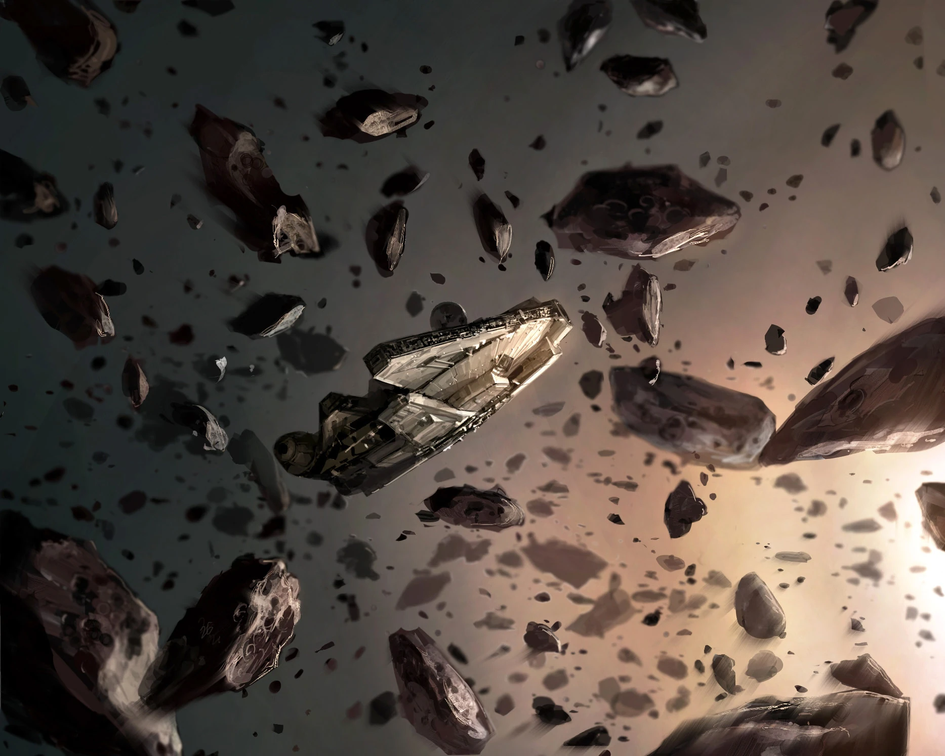 A YT-1300 light freighter navigating an asteroid field