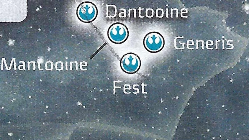 By 2 BBY,[12] Fest, Mantooine, and Generis all acted as operations headquarters for Mothma's rebellion. Such was noted on a map of rebel safe worlds, starfighter hubs at level five or higher, operations headquarters, shadow planets, and deep space caches sent to Mothma. The map, public statements on the Liberators' fight at the Mantooine garrison, and the message of Travia Chan's agreement with Mothma's terms, were all included in the compilation of non-electronic documents known as The Rebel Files by archivist Hendri Underholt. Mothma went on to officialize the rebellion as the Rebel Alliance later[3] in 2 BBY.[13]