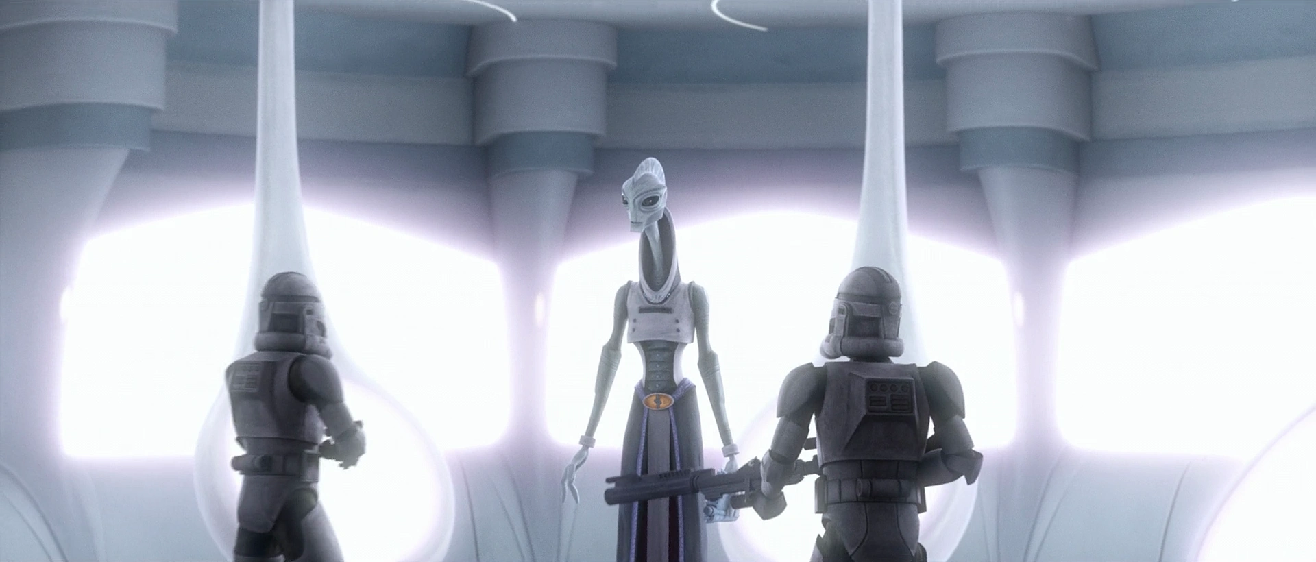 Nala Se escorted a unit of clone cadets out of the city, one of whom was curious why they were leaving as it was against protocol. However, she promised them they would finish their training elsewhere and still have the opportunity to be soldiers. Seeing the Prime Minister approaching, she excused herself from the cadets. Speaking in private, Lama Su informed Nala Se of the cancelled contracts, and admitted that the Empire was not like the Republic, and that the Kaminoans had empowered the Empire to their own detriment. Nala Se asked if they might be able to find new clients elsewhere, but the Prime Minister doubted the Empire would allow them to. He ordered her to gather the necessary personnel while he arranged for their departure.[2]