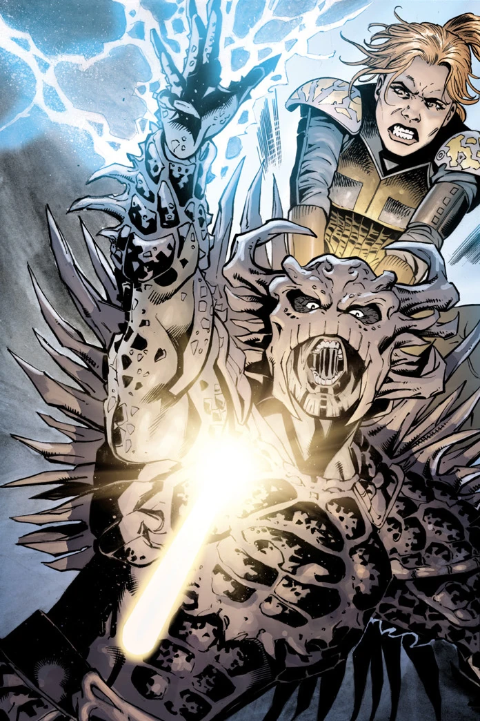 Morne used Skywalker as additional bait and contacted Krayt, inviting the Sith Lord to Had Abbadon so that both Skywalker and the Talisman could heal him of a malady he had that was slowly killing him. Krayt arrived along with four of his most trusted Sith Lords: Darths Stryfe, Wyyrlok, Talon, and Maladi. All of the Sith Lords save Wyyrlok confronted Morne and Skywalker, before Rae, Krieg, Draco, and Vao emerged from hiding, having managed to conceal themselves in the Force. The six members of the strike team attacked the Sith, aided somewhat by Morne's unpredictable army of Rakghouls, who ended up cutting the Imperial Knights off from the battle. Adamant that Krayt needed to die, Rae tried to stop Draco from pursuing the Talisman, but was angrily Force-pushed away. Krieg then physically restrained Draco and bid him to go after the Talisman while he and Rae dealt with Krayt.[15] Rae and Krieg stood back-to-back as they made their way through the Rakghouls toward Krayt, who was dueling Morne.[14]