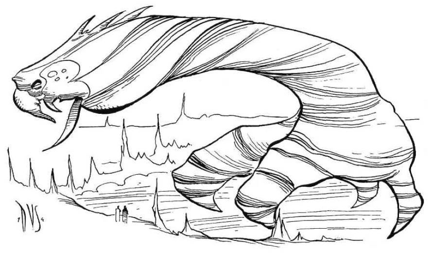Though the entry in Creatures of the Galaxy claims that the Barri are only 5 meters in length, the picture accompanying the entry shows two figures watching a Barri pass by, and are dwarfed by the immense size of the creature.