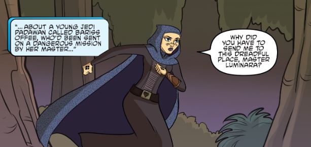 At some point, she studied lightsaber techniques with Tutso Mara, and the two grew to become close.[8] At one point she was sent by Unduli to retrieve an old book. During the mission, she encountered a creature and many traps. When she finally reached the location of the book, she picked up the book and it turned to sand. Later she returned and told her master that she had failed. Unduli told Offee that she did not fail because she never expected Offee to actually bring it back, that it was about the journey and everything she did to find the book.[9]