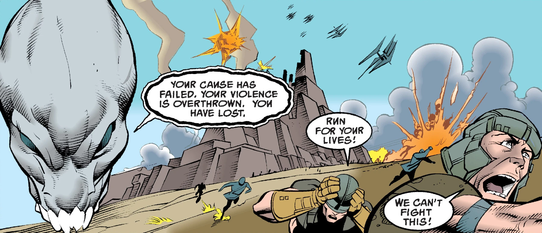 - "Every soldier knows that war is more than arms and armor, every warrior carries an image of impending victory in his heart. When the image shatters, to be replaced by defeat, he is beaten. But sometimes a warrior receives assistance from an unexpected source, an in-rush of light, blasting away his fear and despair, releasing new inner strength! Yes, a war is much more than arms and armor. Half of every conflict is the will to win. We are Jedi. We must recognize that the will to win, and the power of war, are given sometimes by the dark side. And sometimes, as dawn throws back the night, victory is given…by the light!"