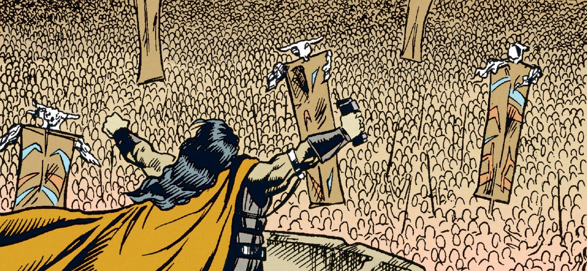 During the reception, the Jedi learned that Amanoa was secretly a practitioner of Sith magic and was harnessing it through the spirit of Freedon Nadd, an ancient and deceased Dark Lord of the Sith. Through Amanoa, the citizens of Iziz—the Naddists—worshiped the memory of Nadd, and those who refused to submit themselves to his power were banished to the wilderness beyond the walls—left to be devoured by the wild beasts whose domain it was. These exiles managed to conquer the beasts and amass themselves into a sizable beast-riding army with which to eventually combat Amanoa's forces. After spending years trading information and conspiring with the city's political underground,[3] Modon felt as though the time had come to act. Ulic Qel-Droma convinced Galia and Oron to present their union as a truce before Amanoa, with hopes that she would end her war and make peace with her enemies. Modon, however, was skeptical in the chance that diplomacy would prevail, and instead gathered the other Beast-Lords in preparation for war, in the event the Jedi peace mission was unsuccessful. Under his banner, thousands of Beast Riders rallied in the wilderness, united in the largest host ever gathered up to that point on Onderon for the final battle against the citizens of Iziz.[1]