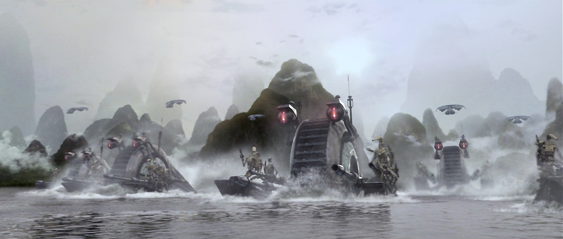 The battle began with a Separatist fleet deployed in orbit around Kashyyyk and a droid army deployed to occupy the Wawaatt Archipelago, establishing a planetary shield perimeter as protection against a counterattack. General Grievous selected the nearby city of Kachirho as his bridgehead. Kashyyyk was largely covered by dense wroshyr forest that provided good defensive cover, but at Kachirho, the shallow open waters of the Wartaki Sea offered a good approach for an amphibious landing, and the lines of communication into the interior were excellent. In preparation for the assault on Kachirho, the Separatists deployed large numbers of HMP droid gunships and NR-N99 tank droids, with considerable infantry support from B1-Series battle droids. The complex terrain made more-conventional armor like the Multi-Troop Transport or the Republic AT-TE unusable.[11]