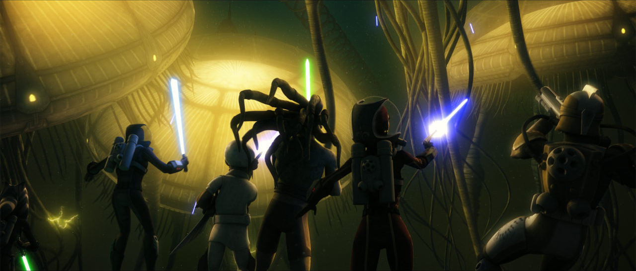 Republic reinforcements then arrived. Clone Captain Rex, Kit Fisto and Ahsoka Tano then deployed the SCUBA troopers from the gunships along with several OMS Devilfish subs to reinforce the Mon Calamari forces. Tamson tore his through the clones and Mon Calamari. Skywalker then briefly lost his helmet to a pair of Quarren soldiers. Tano then gave him his helmet back. Tano led Prince Lee-Char to safety, only for Aqua Droids to follow them into the tunnels. Tano let go of her sub, allowing it to crash into the Droids. Tamson then smashed through the tunnels attempting to get to the Prince before he was distracted by a group of Mon Calamari soldiers, which he killed shortly after. Amidala called for Skywalker to assist her in helping Senator Tills away from the battle, and told them of their location in the palace.[5]