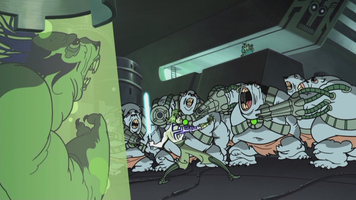 The Head Techno Union Scientist dies at the hands of Skywalker.