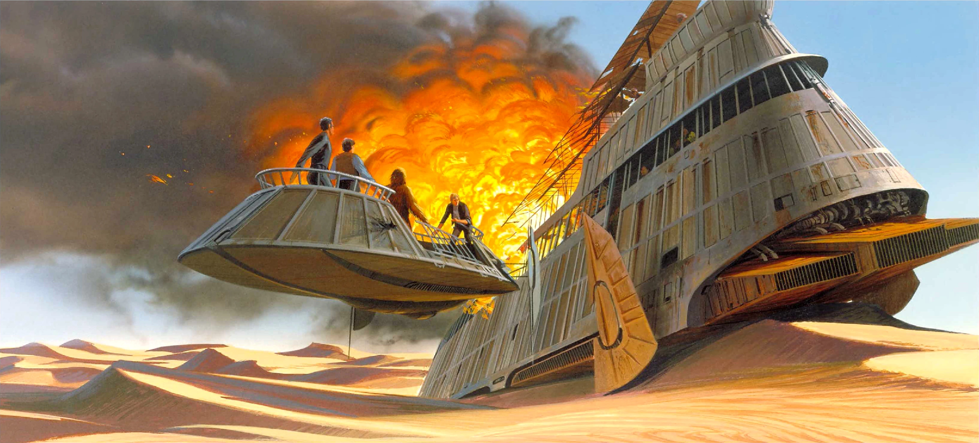 As a battle raged outside, Organa used the chaos to cut power inside, closing the side viewports and throwing the interior into darkness. In the confusion she threw her chain around Jabba's body, and using all her strength, choked him to death. With the help of R2-D2, she was released from her chains, Salacious started to rip out Threepio's wires from the droid's photoreceptors and Artoo shocked Salacious away from Threepio the droids then hurried to join Skywalker on the deck, followed by Artoo and Threepio. Skywalker told Organa to aim the cannon at the deck of the barge, at which point Taym Dren-garen shot his right hand, exposing his mechanical limb, but the Jedi quickly recovered and continued to prevent any guards from reaching the cannon. R2-D2 pushed C-3PO from the barge and both droids landed getting partially buried in the sand. Skywalker swung with Organa from the barge to the skiff just as he kick-started the blaster cannon. After picking up the droids, Calrissian piloted the remaining skiff with all the rebels aboard safely away from the ensuing explosion of Khetanna.[1]