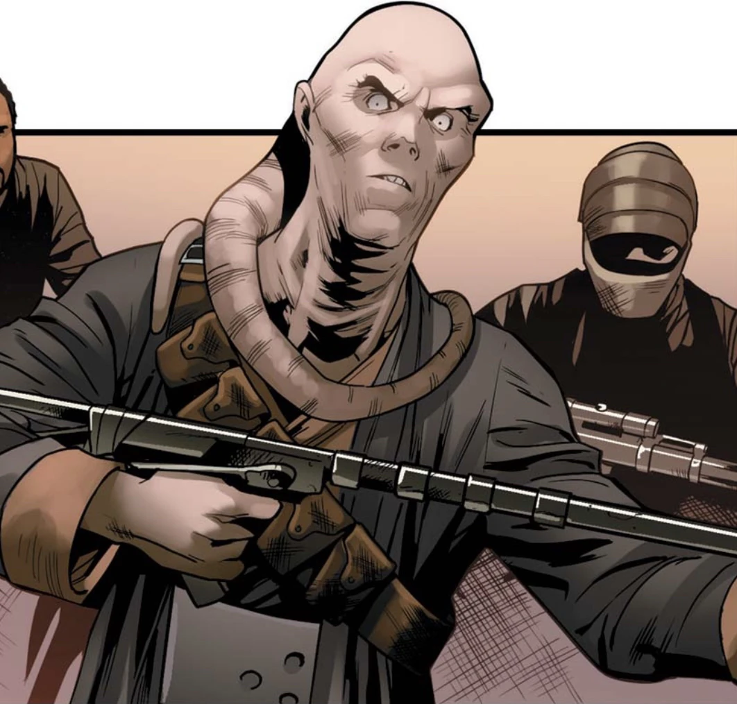 A pale-skinned Twi'lek male, Beezer Fortuna had a gaunt physique and thin, desiccated lekku. He had piercing blue eyes and sharp, angular features. As one of Saw Gerrera's Partisans, Fortuna wore dark robes and carried an electro-prod staff.[1]