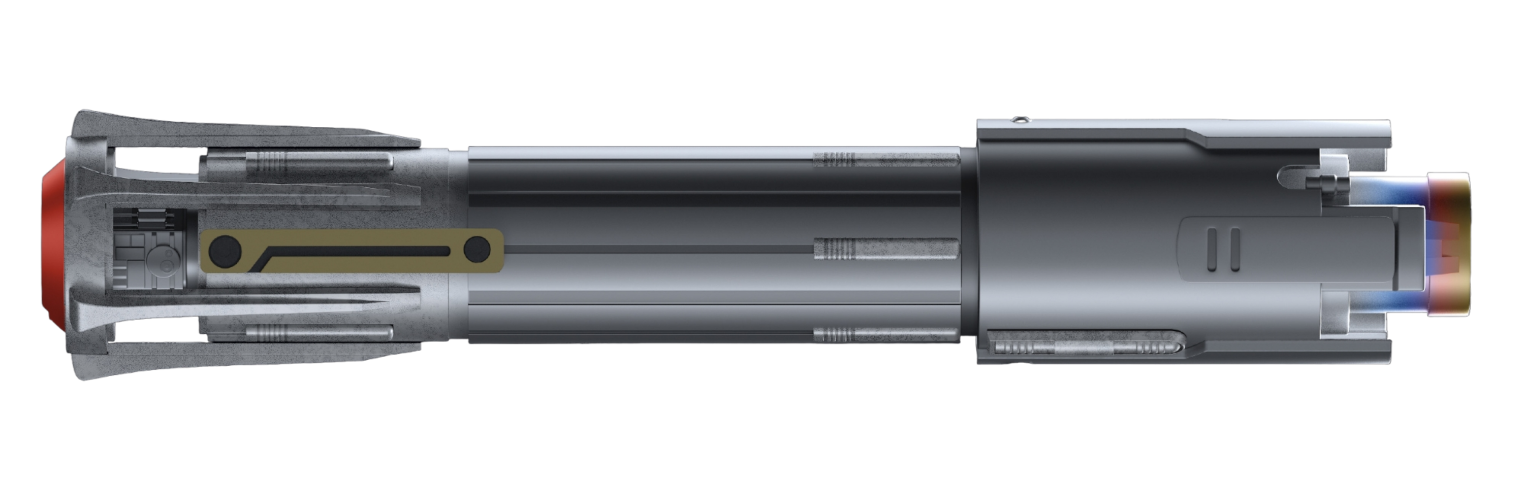Kylo Ren repurposed the kyber crystal and lightsaber hilt formerly used as Ben Solo to create his new[10] Sith lightsaber.[4] First, he used the dark side to bleed the crystal; it cracked in its master's grip with a surge of fiery energy. Its hue was thus changed[10] to red-yellow.[105] In order to channel dangerous amounts of power through this broken crystal,[6] he added vents on either side to divert the excess heat and produce Quillion blades.[47]