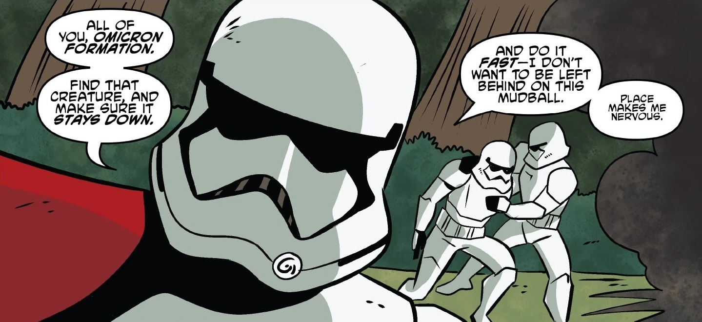Daz Crano contacted Beaumont Kin that she believed her Porg spotted something when flying over the forest. Inside the forest, Kin told her that Prog was probably wrong. Daz decided to go double check anyways as Beaumont and his group continued through the forest. At a First Order encampment, the Wookiees were locked up in a cage as the stormtrooper commander ordered two of his soldiers to go find SN-1208.[4]