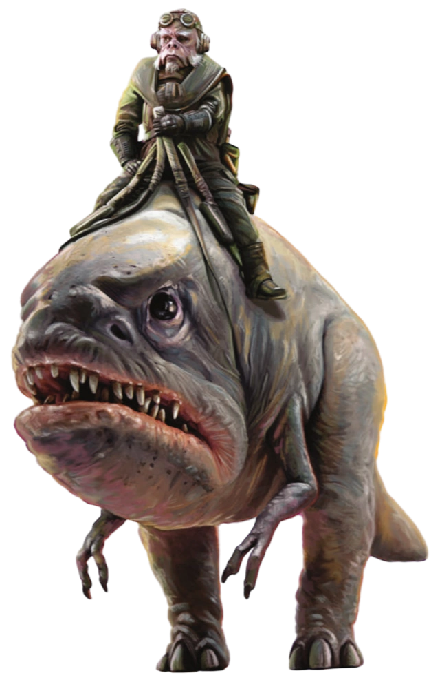 The Twi'lek Cham Syndulla stands beside a blurrg, providing a size comparison.