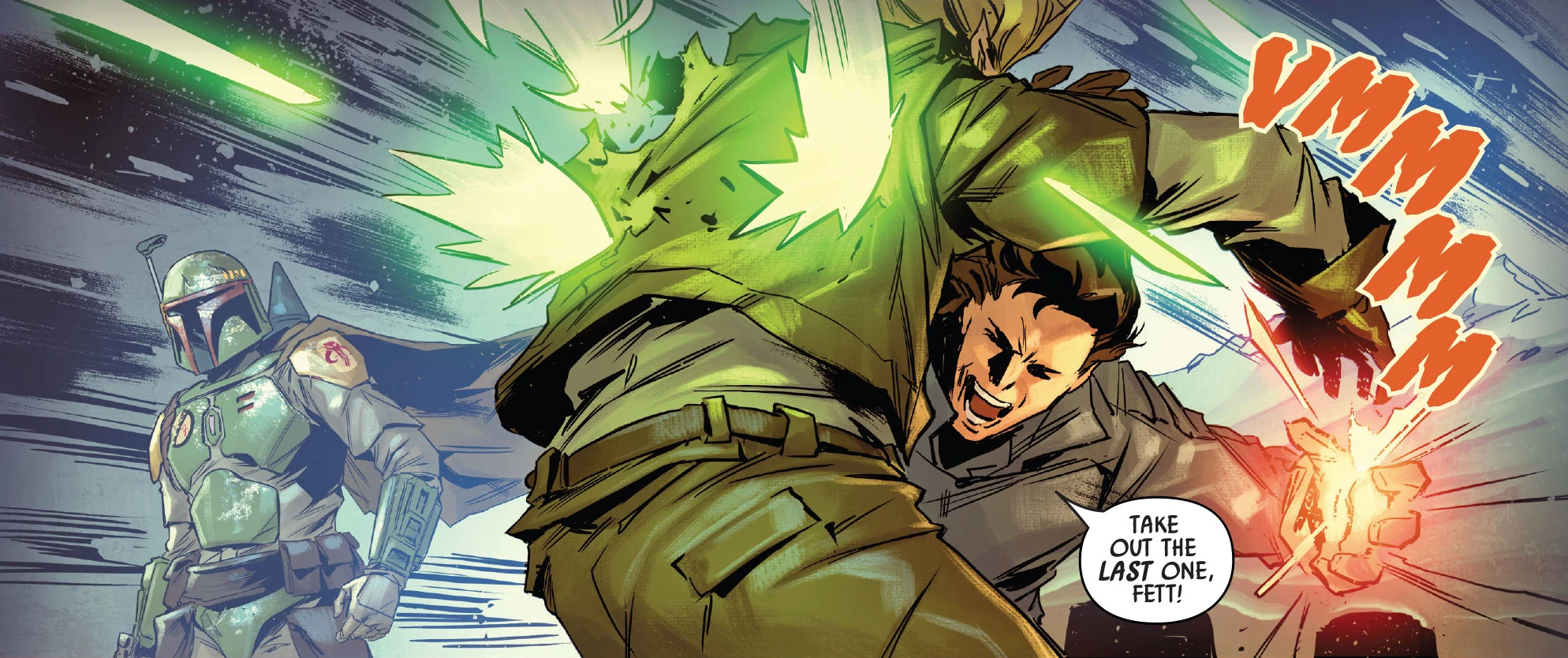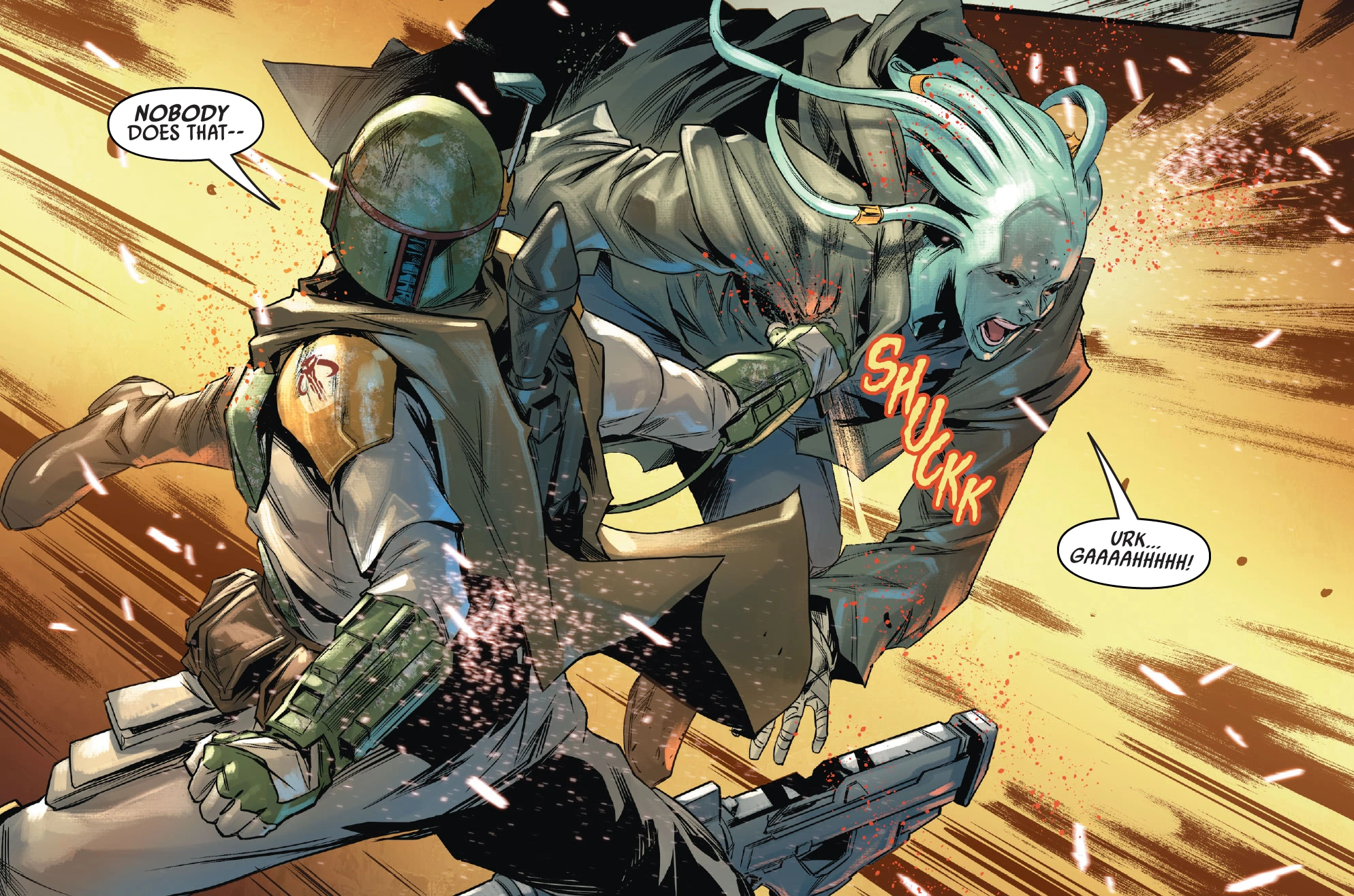In an attempt to survive from the wrath of the Mourner's Wail Syndicate, Fett planned on killing Lash. However, He missed his shot after an intervention by Valance, who was not happy about Fett's plan and wanted to protect his mentor; the shot killed T'ongor instead. Before the two bounty hunters could argue further, Unbroken Clan forces approach them, which caused Fett to flee from the scene. The failure at Corellia damaged Fett's reputation, which made him develop a great hatred for Lash,[44] and severely damaged the relationship between Bossk and Fett.[45]