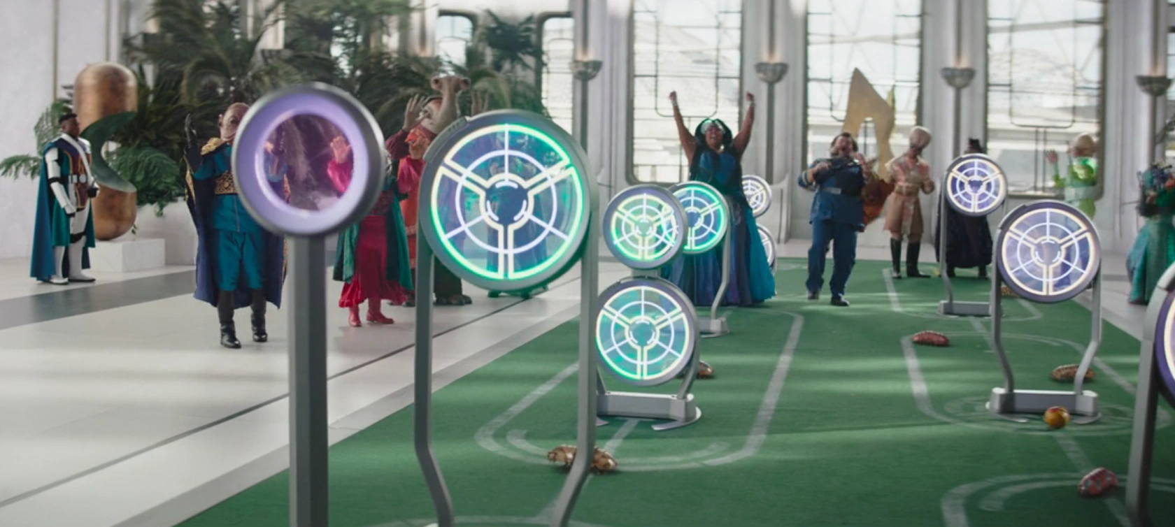 While waiting for the return of their new allies, the Duchess and Bombardier played a game involving bouncing[2] pill bugs through various scoring hoops.[3] Using the Force, Grogu assisted the Duchess in scoring a quadro-blast, causing a watching crowd to cheer and the captain to announce that he had never seen such a streak. As the celebrating died down, Kryze and Djarin entered with Plazir-15's Commissioner Helgait in cuffs.[2]