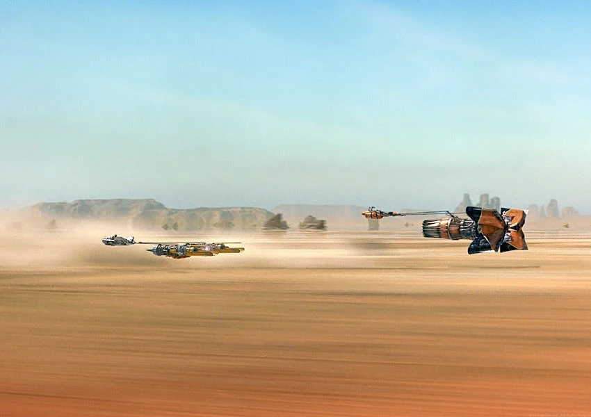 The race then continued onto a length of desert plains abutting the Dune Sea. One of the most hazardous areas—Arch Canyon—forced pilots to maneuver through stone wickets before entering another series of canyons, including The Whip, Jag Crag Gorge, and the subterranean Laguna Caves. Emerging from the caves, the pilots careened through the tight Canyon Dune Turn, known to be a campsite for vengeful Sand People.[1]