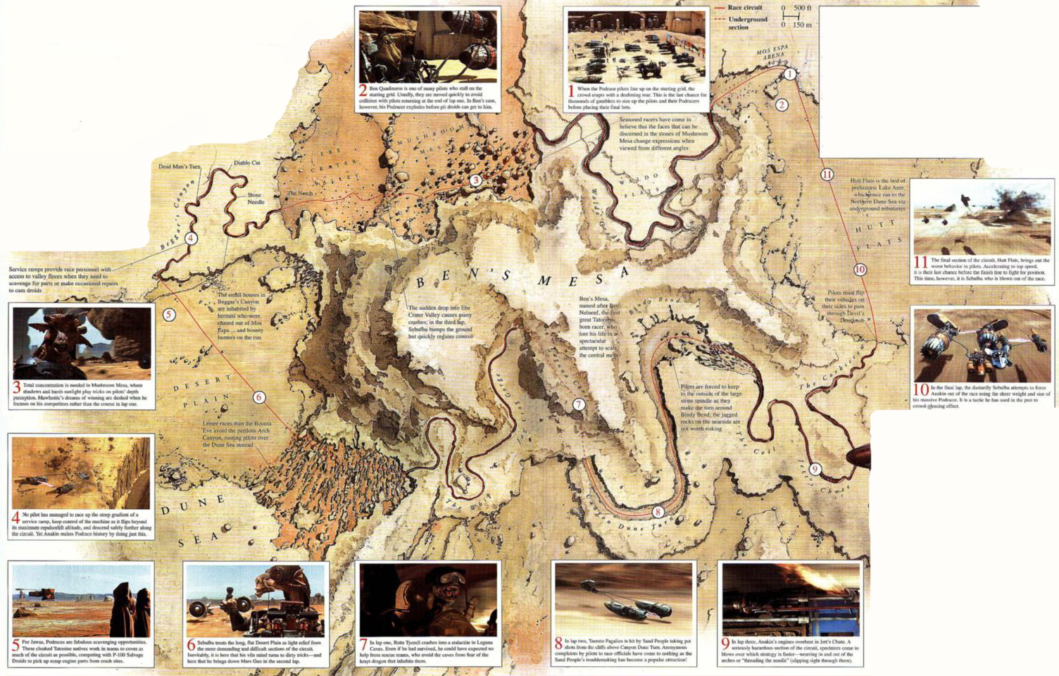 The Mos Espa course mostly turned around Ben's Mesa. It blazed out of the arena onto the Starlite Flats, an easy stretch of desert where aggressive Podracers jockeyed for strong starting positions. The racers had to line up in single file to enter the curving canyon that cuts through the Waldo Flats. This opened up into Mushroom Mesa, a rocky expanse dominated by immense bulbous rock formations. Metta Drop, a sudden escarpment, dropped the racers onto Ebe Crater Valley, where they again had to navigate a narrow opening (the Notch) to enter Beggar's Canyon.[1]